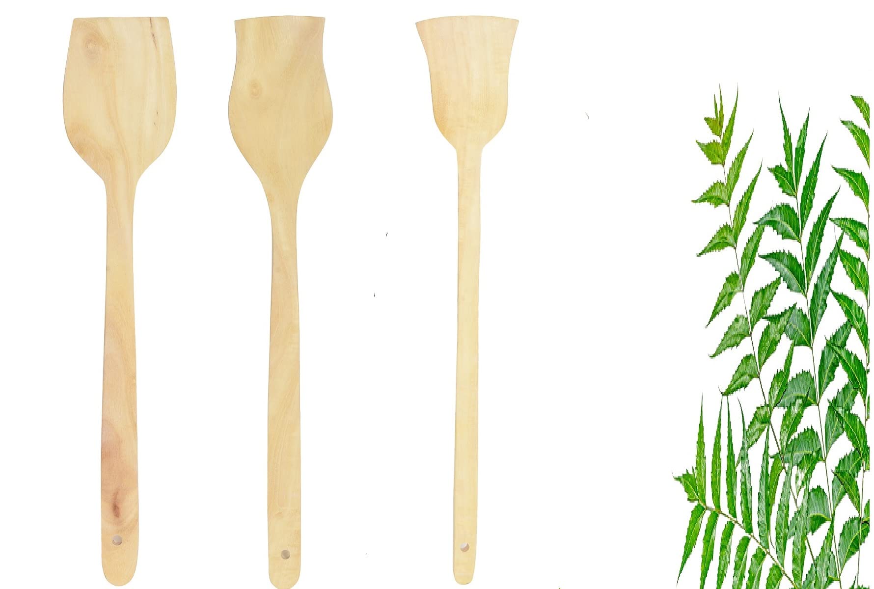 This Wooden Ladle Made of Deshi Neem wood. We know that neem wood is a precious wood. Set of 3 Kitchen spatulas are Safe for non-stick cookware. Get this wooden spoon cooking and serving. Dimensions: Length ranging from 28 to 38cm Spatulas are made from a single block of neem wood so it doesn't have any joints. No harmful shining polish is used which is harmful for health and prohibit the neem wood antibacterial function. The non-scratch wooden spatula is not going to leave any scratch on pan. Use mild soap and warn water for cleaning.