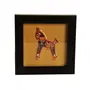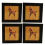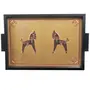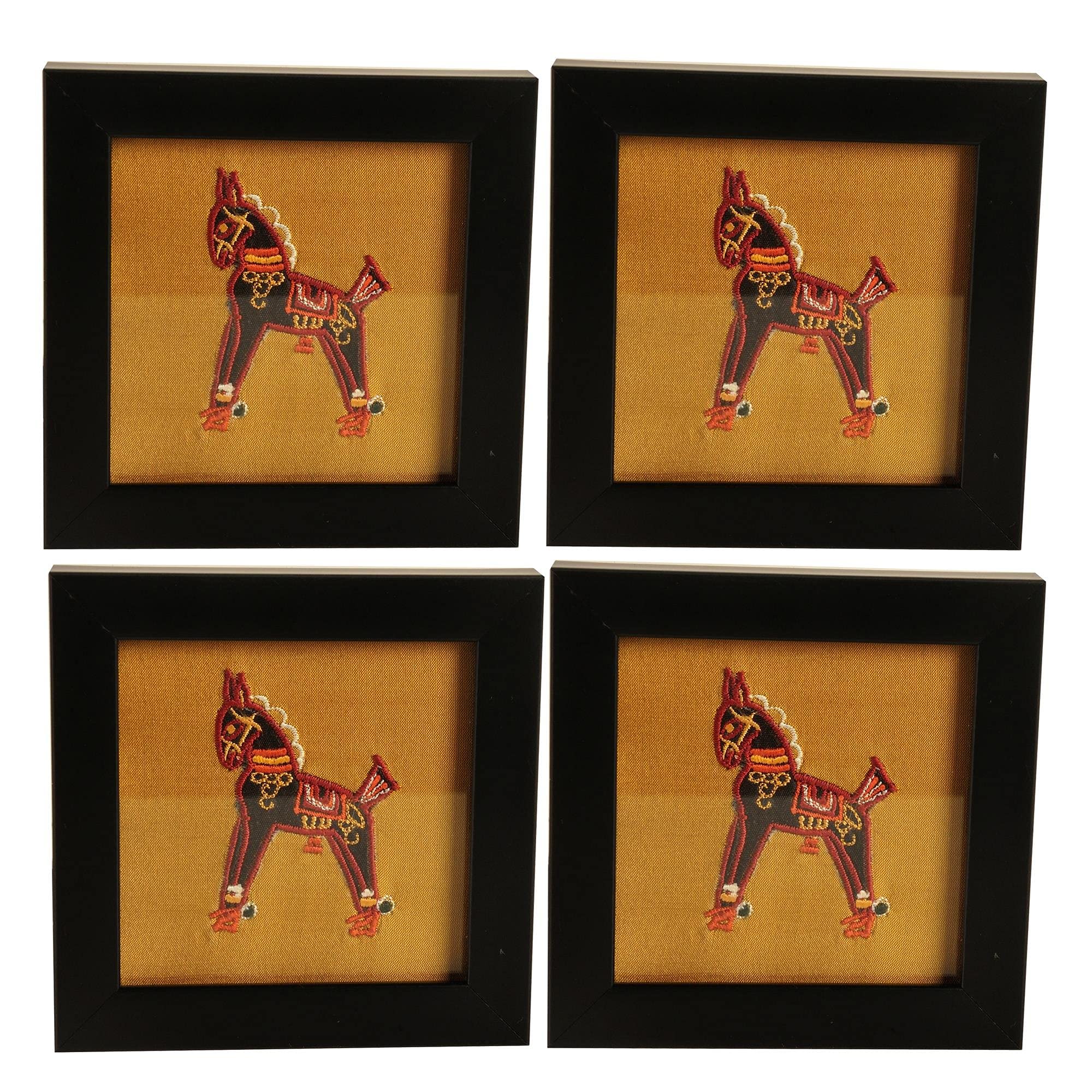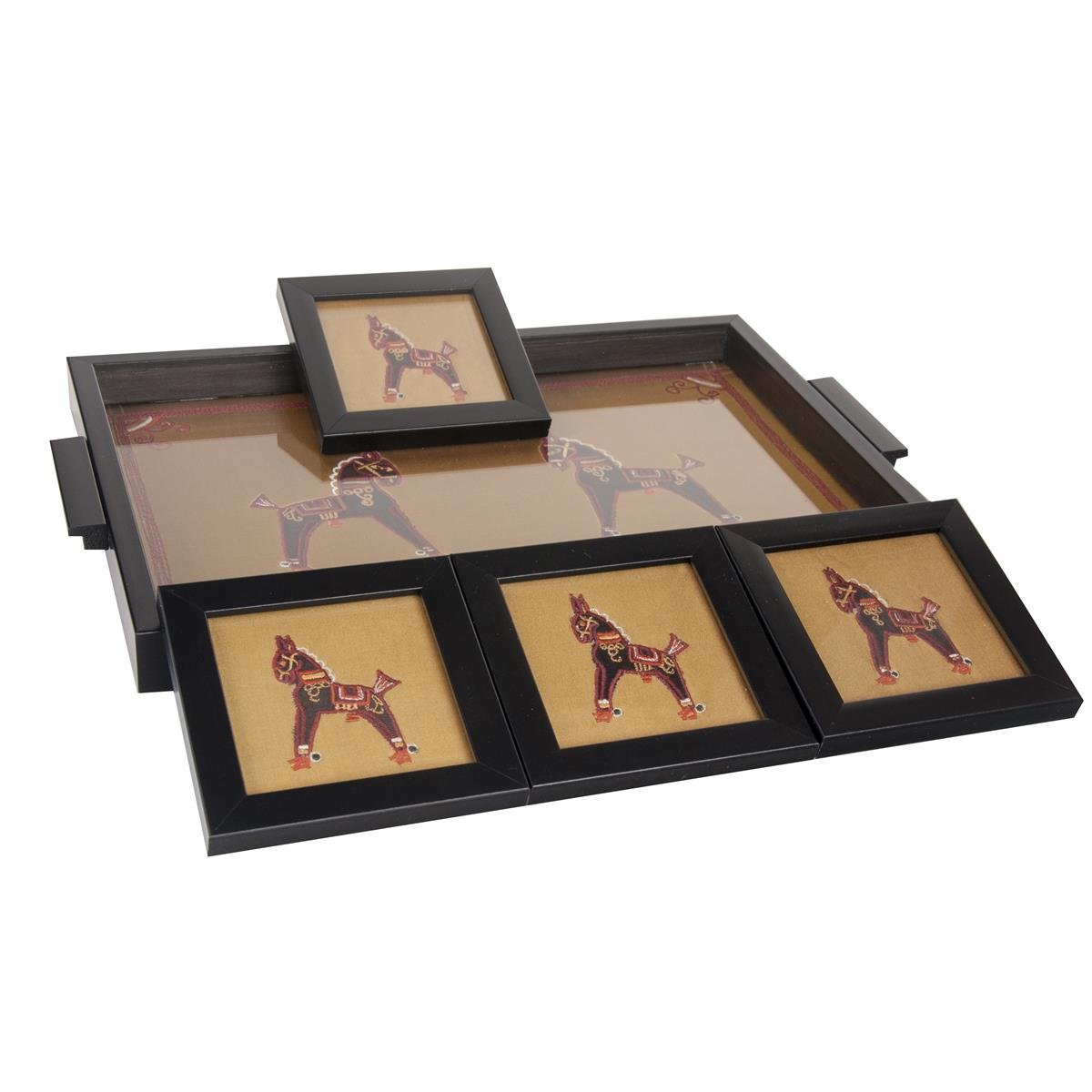 A JAMINI ROY HORSE MOTIF INDICATIVE OF NATIVE FOLK PAINTING AND TERRACOTA STYLES IN BISHNUPUR BENGAL TREATED IN PATCHWORK AND EMBROIDERY WITH FESTIVE COLORS LEND A REFINED AND ELEGANT TOUCH TO THE TEXTILE INSERT IN THIS SET OF TRAY & WOODEN COASTERS WITH GLASS TOP. The horses of the legendary painter's works evokes a feeling of warmth and rich history rendered in a fashion that is traditional and yet contemporary enough to feature prominently in any part of the house.