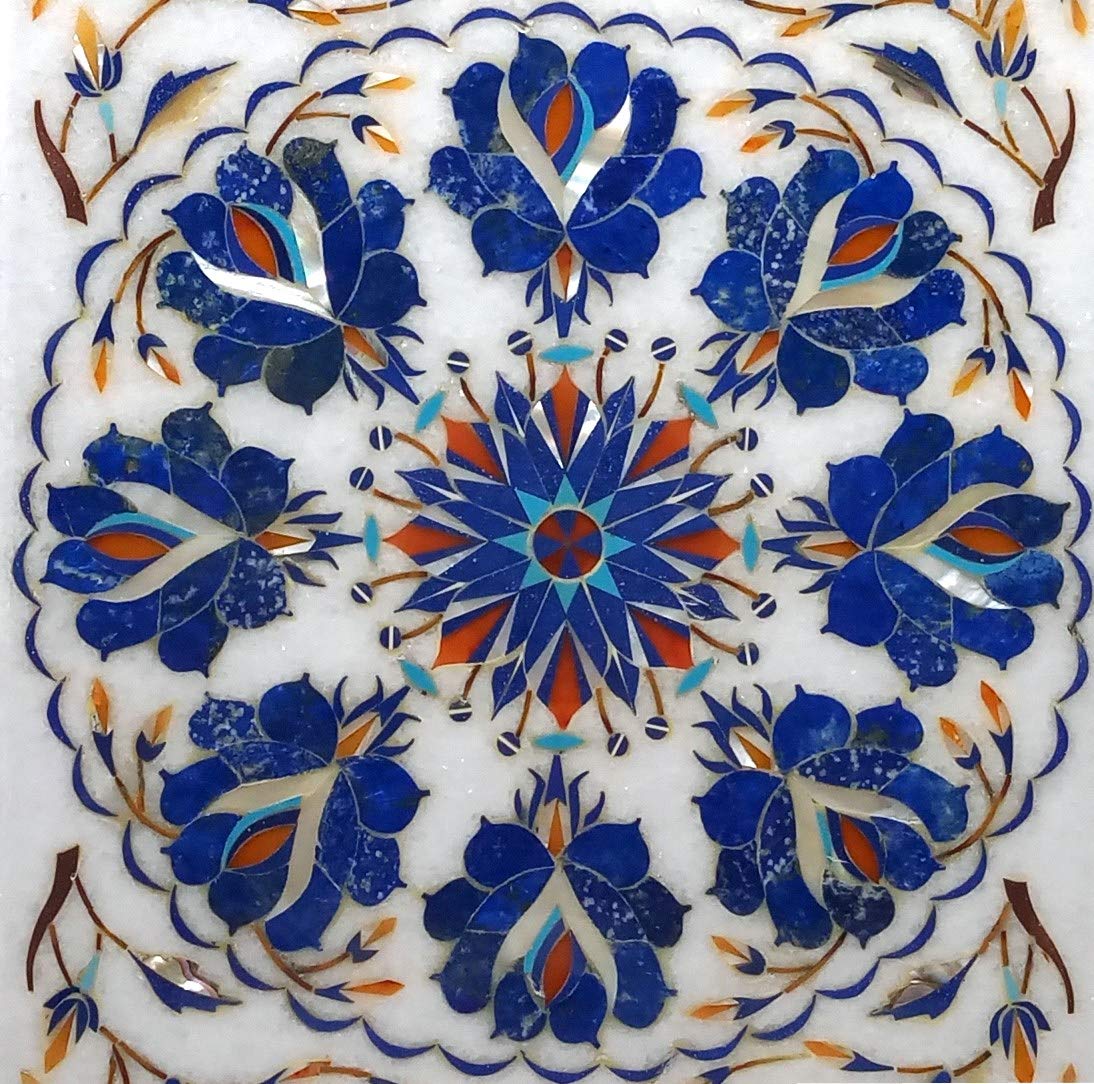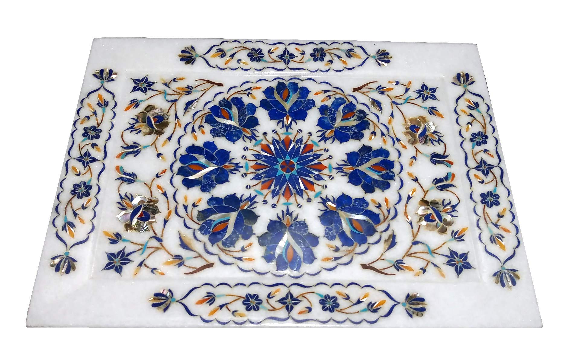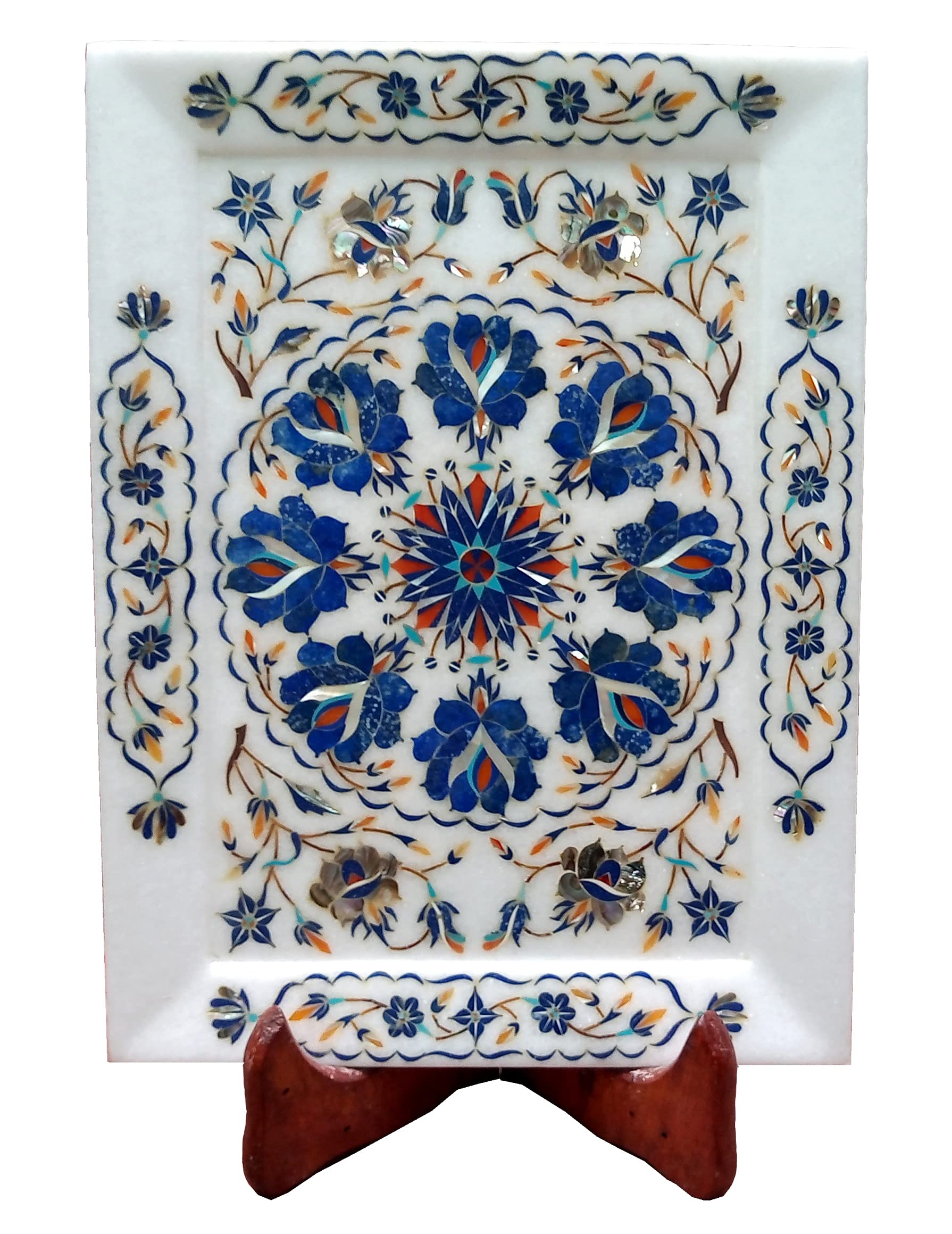 The White Marble Inlaid Tray is made in Agra India & fully handmade with inlay stone not a color. MARBLE INLAY ART AGRA - PACCHIKARI Handcrafted White Marble Plate Perfect for Office Home and Hotel Decoration. Design: Floral with Rangoli design. This can be Used a Cake Board as well. We will send you a paper with description and Meaning of the stone . We will send you wooden stand also to display. We are himself manufacture of this product so we do custom design also. To maintain this art piece simply clean it with soap water and dry cotton cloth. Stone Inlaid Into The Tray Are Follows : Carnelian - Orange Lapis lazuli - Blue. Mother of Pearl - White. Jasper - Brown. Turquoise - Sky Blue. Colorful Shiny - Pauch Shell.