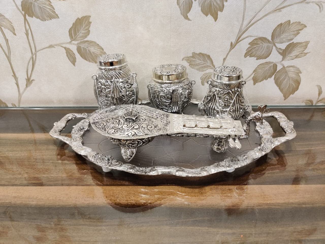 Consisting of 3 little tabla is of various shapes and sizes and a conventional Indian stringed instrument the whole set is exceptional. If you want to impress your guests with your royal taste then this mouth freshener holder designed in the shape of sitar & tabla set is just right for you. Consisting of three small handis of different shapes and sizes and a traditional Indian sitar the entire set is truly remarkable. Ideal as Indian gifts for foreigners or retirement return gifts!