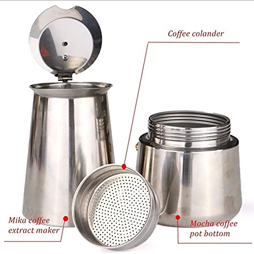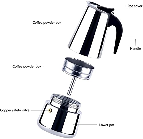 If you love and enjoy the happy life of coffee the quality of espresso coffeepot is definitely a top priority. The espresso maker is made of food-grade safe 430 stainless steel and has strong anti-corrosion and rust resistance. Because use high-quality material to make the extraction pothole make the coffee that makes more mellow bring high-quality coffee to you to enjoy. Appealing Design Elegant espresso maker body through polishing design three ring precision thread and imported safety valve to make your use process more secure. Simple And Elegant Design Our products are known for their stylish design. With different variations in silver and copper-chrome finish we aim to cover a wide range of tastes and wants. We attach great importance to quality and functionality. Our espresso maker is made of high-quality stainless steel and one of the best available. Easy To Care For We recommend cleaning the espresso maker after use. If the coffee grounds remain in the filter for too long discolouration may occur.