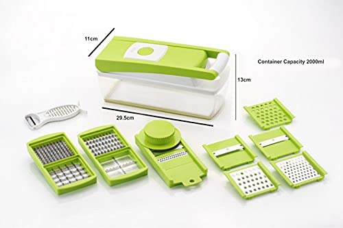 1 Plastic Container 1 peeler with grater 1 safety holder 1 masher & 1 handle with cleaning press Blades: 2 dual 2 slicer 2 grater 1 Juliane blade die attachment