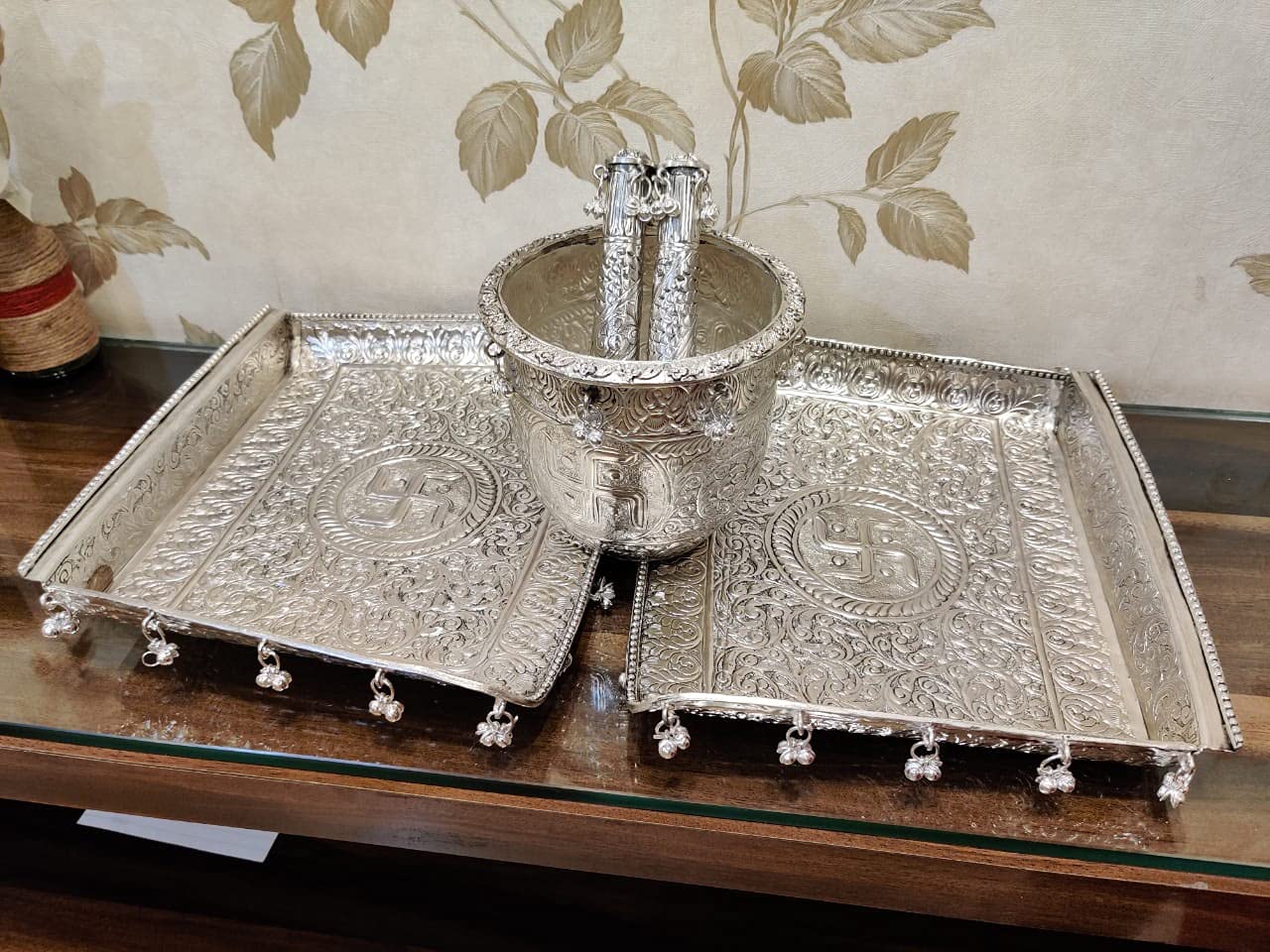 Pure German silver hand engraved- Chajla Okhli/ukhal & Musal set for Indian Wedding Rituals. Inclusions- 1 Pc Okhali 2 pc Musal 2 pc Chajla Product Size Okhli: 6.5inch X 5.5 inch Musal:7 inch Chajla:10 inch X 12 inch Khal dasta or hamam dasta is widely used products in almost all homes as well as restaurant.It is used for pulverizing various herbs such as ginger garlic cilantro peppermint leaves etc. Is also used to crush or grind dried spices. Now enjoy the freshness of spices and traditional taste at your home .