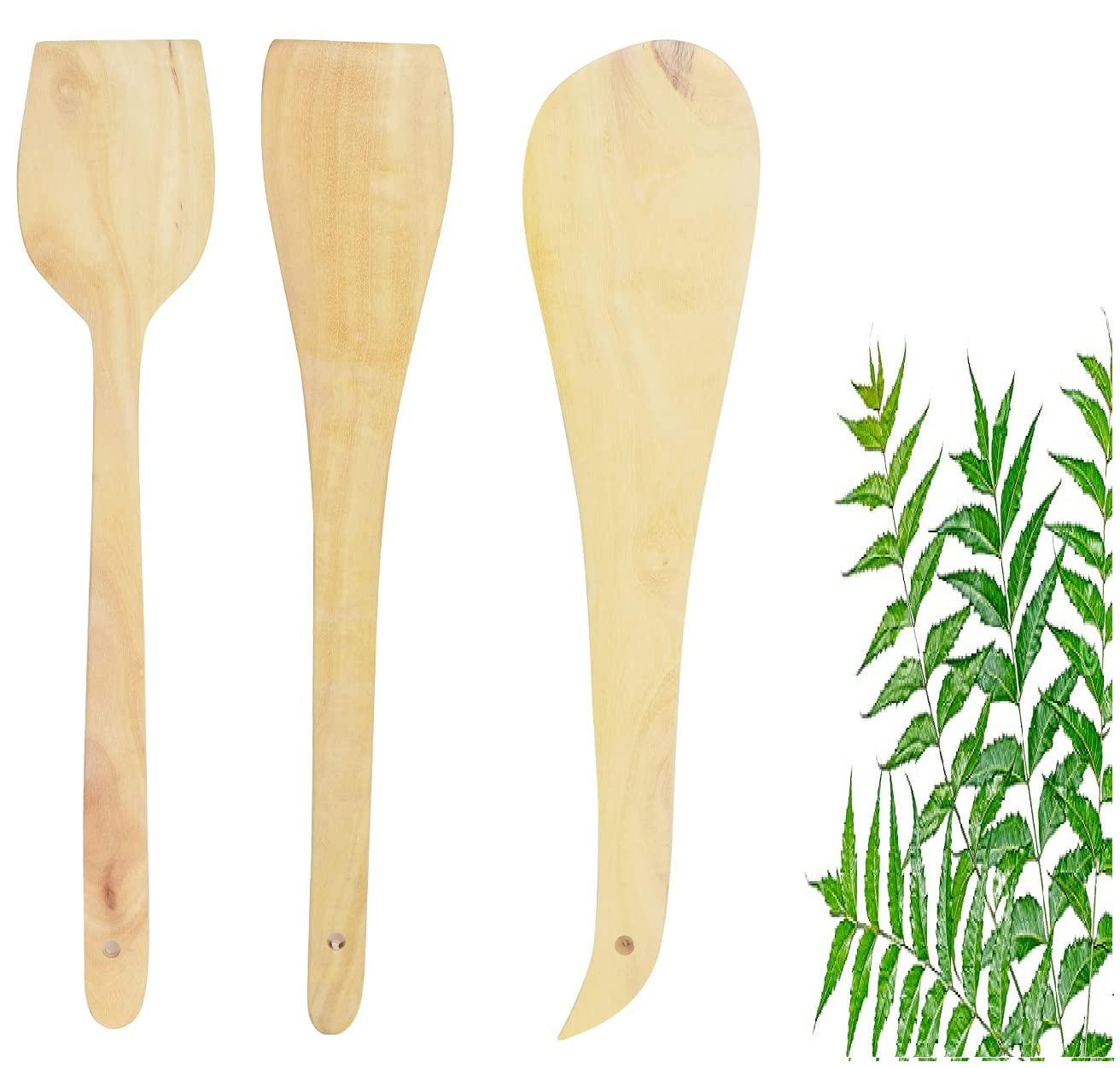 This Wooden Spatulas Made of Deshi Neem wood. We know that neem wood is a precious wood. Set of 3 Kitchen Spatulas are Safe for non-stick cookware. Get this wooden spoon cooking and serving. Dimensions: Length ranging from 28 to 38cm Spatulas are made from a single block of neem wood so it doesn't have any joints. No harmful shining polish is used which is harmful for health and prohibit the neem wood antibacterial function. The non-scratch wooden spatula is not going to leave any scratch on pan. Use mild soap and warn water for cleaning.