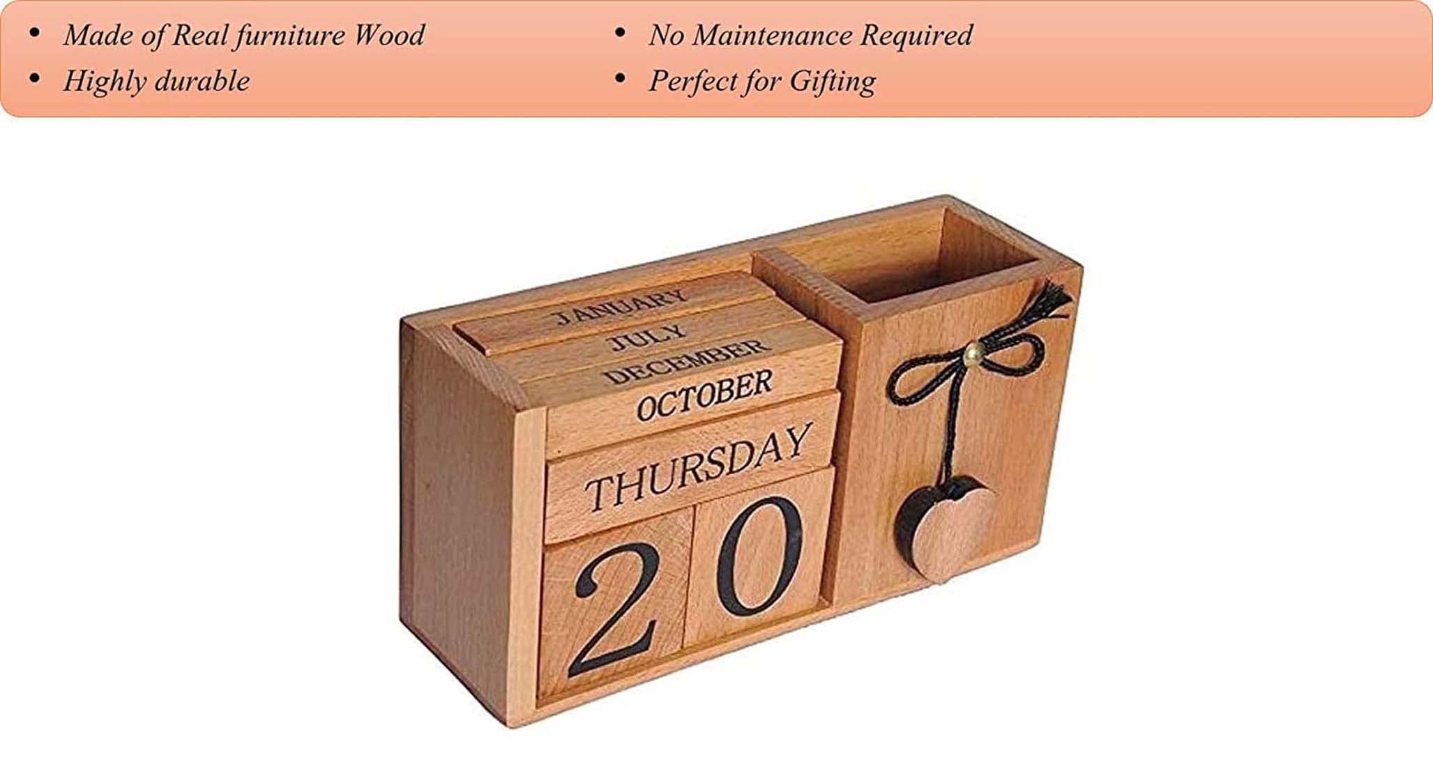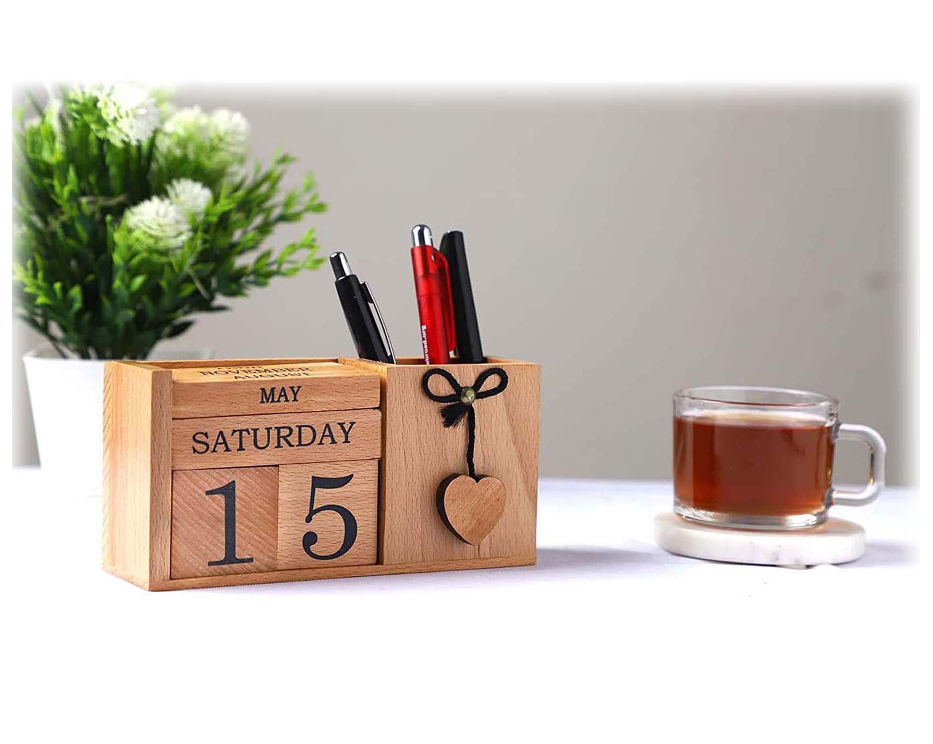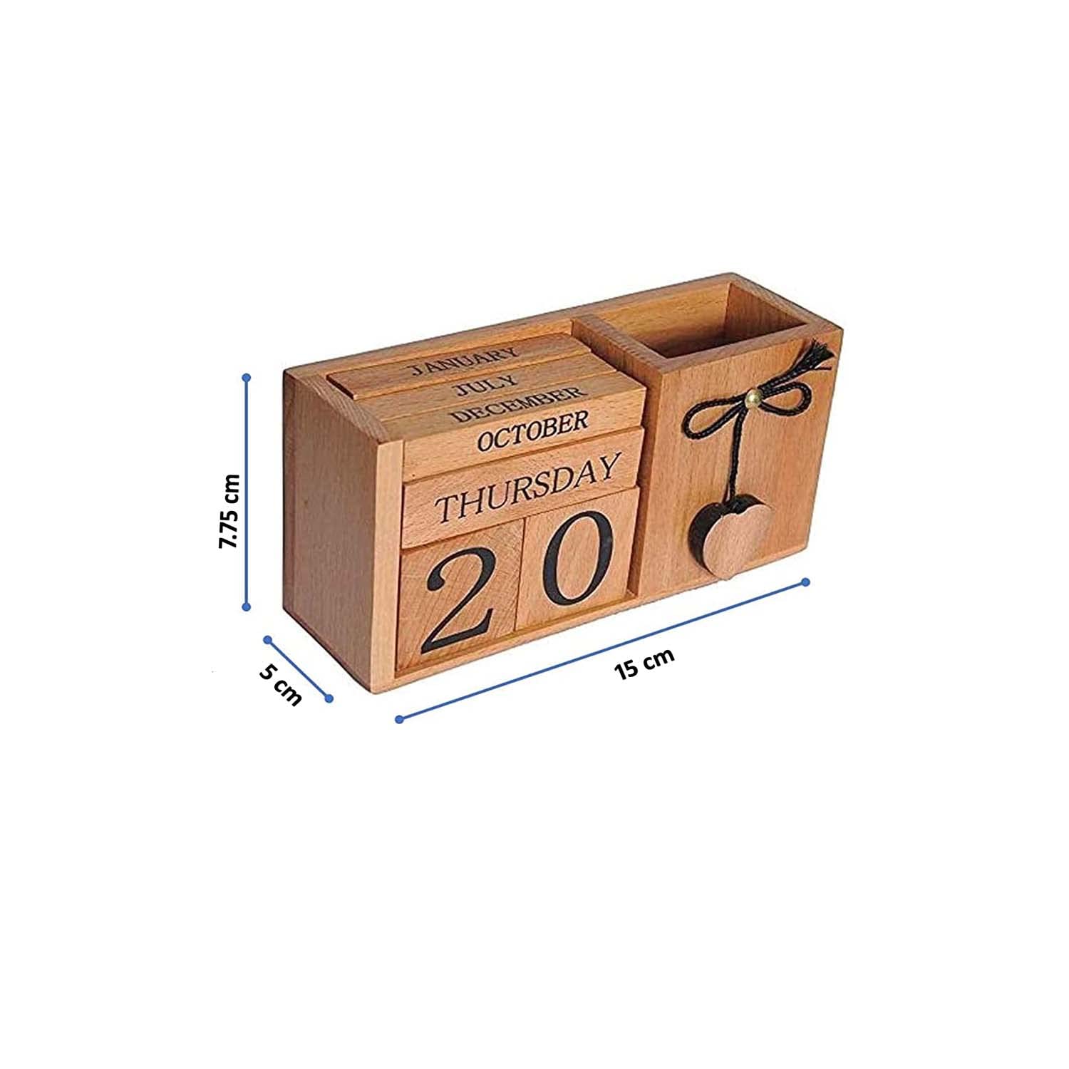 BIJNOR - METAL INLAY IN WOOD Handmade Wooden Desk Organizer Wooden Date Calendar Deck Calendar with Pen Stand Set Pen Stand Business Card Holder with Wooden Calendar for Office Table Accessories