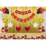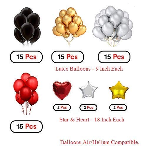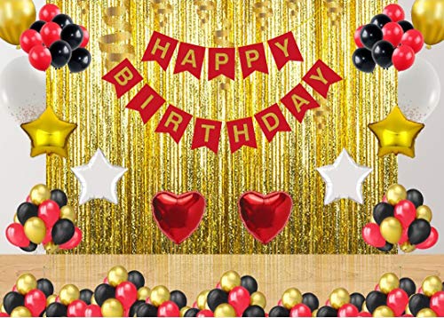 This happy Brthday decoration includes happy Brthday red banner - gold foiled fringe curtain - foil balloons - latex balloons . It is Perfect for surprise Brthday decoration complete your decor for Brthday.