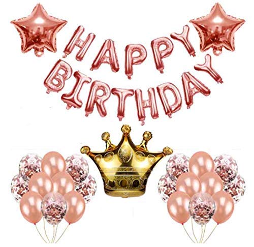 Pack includes rose gold happy Brthday foil balloons with 10 rose gold chrome confetti along with a golden crown foil balloons and two rose gold star foil balloons