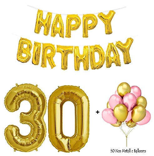 Number 30 Gold Foil Balloon and 50 Nos Pink and Gold Color Latex Balloon and Happy Brthday Gold Foil Balloon Combo
