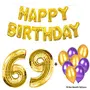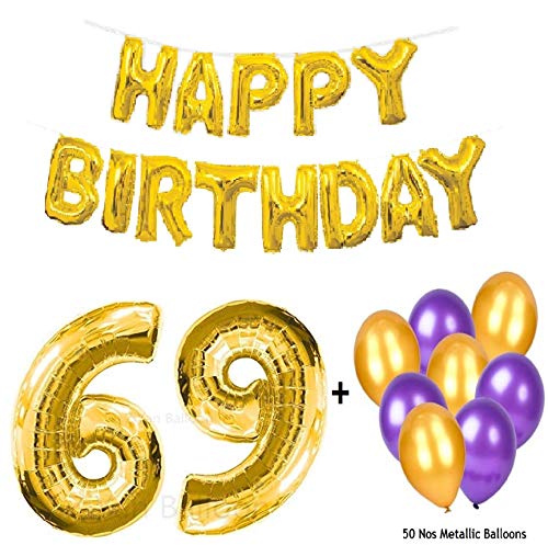 Number 69 Gold Foil Balloon and 50 Nos Purple and Gold Color Latex Balloon and Happy Brthday Gold Foil Balloon Combo