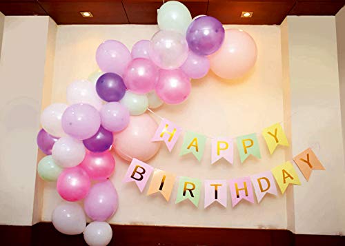 Add a magical touch to your Brthday parties with this cute Pastel balloon Brthday decor kit. Perfect for KDs friends family boys girls. The kit comes with a balloon pump that helps you save a lot of time. This decor works with every theme and can be easily put up on the walls by anyone using simple tape. Material : 30 Pastel Balloons 1 Happy Brthday Pastel Bunting 1 arch tape 1 Balloon Pump Instructions : i. Blow all the balloons in different size using the balloon pump. ii. Put the end of each balloon in each hole of the arch tape to make an arch. iii. Place the arch on wall as desired. iv. Put Happy Brthday Bunting just below the arch.