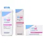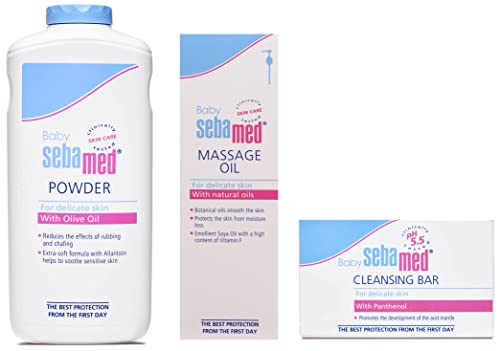 Sebamed Baby Massage Oil 150ml100 Percent botanical non sticky massage oil. Superior spread ability and faster absorption. Conventional massage oils contain mineral oil colorants and other irritants which can cause allergic reactions. Sebamed soothing massage oil contains 95 percent soy oil contains essential fatty acids which ensures superior hydration. 5 Percent wheat germ oil is the richest source of vitamin e. Sebamed soothing massage oil does not solidify at lower temperature made in Germany gentle care and protection of babyâs sensitive skin emollient with 95 percent natural soya oils high content of formula with vitamin f a soya oil compound insures high skin tolerability gentle protection for delicate baby skin ideal from day 7 2 years0 percent irritant reactions and almost 0 percent allergic reactions.Gentle Care and Protection for Your Baby's Skin The Sebamed baby massage oil is perfect for taking gentle care and protecting your baby's sensitive skin. As your baby's skin is extremely tender it is vulnerable to hot and cold weather as well as skin problems like dry skin and diaper rash. This oil acts as an emollient soothing and softening your little one's skin and is made of 95% natural soya oils. You can strengthen and increase your baby's skin tolerability as this Sebamed massage oil contains a high content of Vitamin F which is a soya oil compound.Provides Wide Reaching Benefits With this baby massage oil you can protect your baby's skin from harmful effects and also help in stimulating the blood circulation and developing the digestive and neurological system of your baby. Pain caused due to gas teething and illnesses are very distressing for children. The massage oil for baby from Sebamed helps to relieve such painful occurrences. As it is non-greasy this massage oil is also easy to apply and doesn't leave a sticky feeling on your hands. Massaging also helps to enhance the emotional well-being between you and your baby. Brand: Sebamed Soya oil with high content of Vitamin F Emollient featuring 95% natural soya oils Relieve pain of colic gas illness and teething Non-greasy Includes detailed body massage guide Content: 150ml Sebamed Baby Powder 200gMicronized form of tio2 reduces the effect of rubbing and chafing. Absorbs extra moisture from baby's skin to help skin feel comfortable. Extra soft formula with Allentown helps in protecting baby's delicate skin against irritation. Olive oil present in seamed baby powder soothes and protects baby's skin from dryness. Made in Germany olive oil soothes and protects the baby's skin from dryness allantoin makes the skin soft and smooth pleasant botanical fragrance ideal from one month onwards0 percent irritant reactions and almost 0 percent allergic reactions.Sebamed Baby Cleansing Bar - 100 gTriticum vulgare starch disodium lauryl sulfosuccinate stearic acid palmitic acid cetearyl alcohol aqua talc lactic acid sodium lauroyl sarcosinate cocamidopropyl betaine panthenol insulin lecithin glycerine magnesium aspartate alanine lysine leucine tartaric acid parfum ci 77891.Mild and Gentle Soap-free Bar The best choice for your baby's first bath Sebamed baby cleansing bar is mild and gentle soap-free bar for your baby's skin. Containing sodium cocoyl glutamate and amino acids this Sebamed cleansing bar keeps your baby's skin soft and healthy. Seabed cleansing bar but does not strip the moisture off your baby's skin. It also contains the natural skin-related sugar insulin and Panthenol to moisturise and regenerate your baby's skin. Vitamin E which helps in soothing the skin also contributes to keeping your child's skin supple. This soap-free bar will provide complete cleansing without drying out thanks to its pH value of 5.5.Nourishment and Care for Tender Baby Skin This baby cleansing bar is 100% alkali free and helps in stabilising the moisture balance of the skin. It can be used regularly for a bath or to wash your baby's face and hands. Even if your baby is suffering from some skin disease you can use this cleansing bar Sebamed without any worry as it has skin tolerance property. The Sebamed baby cleansing bar 100gm gives complete pore-deep cleansing which helps in combating pimples blackheads and skin impurities. All you need to do is apply it on your baby's skin lather it up and rinse to leave your baby feeling refreshed and relaxed. Brand: Sebamed Ideal for: Pimples blackheads and skin impurities Age: Newborn and up Contains: Moisturisers and amino acids Good skin tolerance even in skin disease Content: 100 g /ul