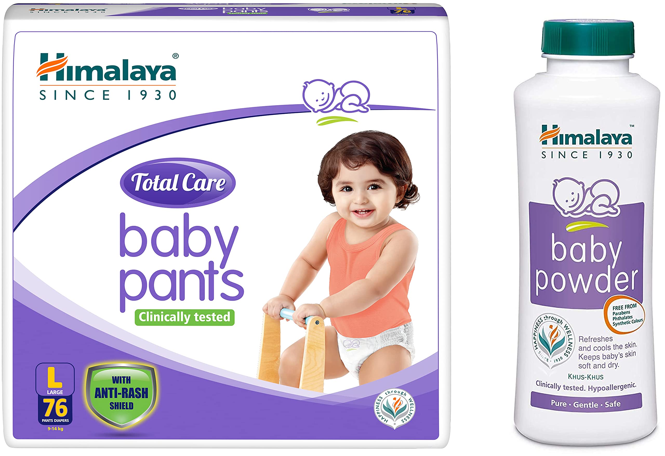 Himalaya Total Care Baby Pants Diapers Large (9-14 kg) 76 Count WhiteHimalaya Total Care Baby Pants are a one-step diaper solution specially designed for comfort protection and total care of baby's skin. Made in an easy-to-wear pant-style design that offers a soft and comfortable fit and are easy to pull on and off.Infused with the goodness of Aloe Vera and Yashada Bhasma Himalaya Total Care Baby Pants offer a protective anti-rash shield that helps reduce the activity of harmful enzymes* and helps prevent diaper rash. Himalaya Total Care Baby Pants have a Super Absorbent Polymer (SAP) layer that absorbs multiple wettings and ensures maximum protection from dampness so that your baby gets undisturbed and restful sleep.Himalaya Baby Powder (400g)Avoid using around baby eyes nose mouth and sensitive areas. Do not sprinkle directly onto baby skin to avoid accidental inhalation.