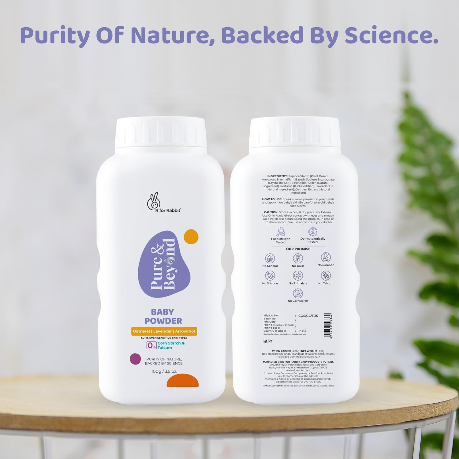 • Corn Starch and Talcum Free Baby Powder: R for Rabbit’s Pure & Beyond Baby Powder is a corn starch free and talc free baby powder made with natural Tapioca Starch and Arrowroot Starch to quickly absorb moisture while ensuring safety of your baby.