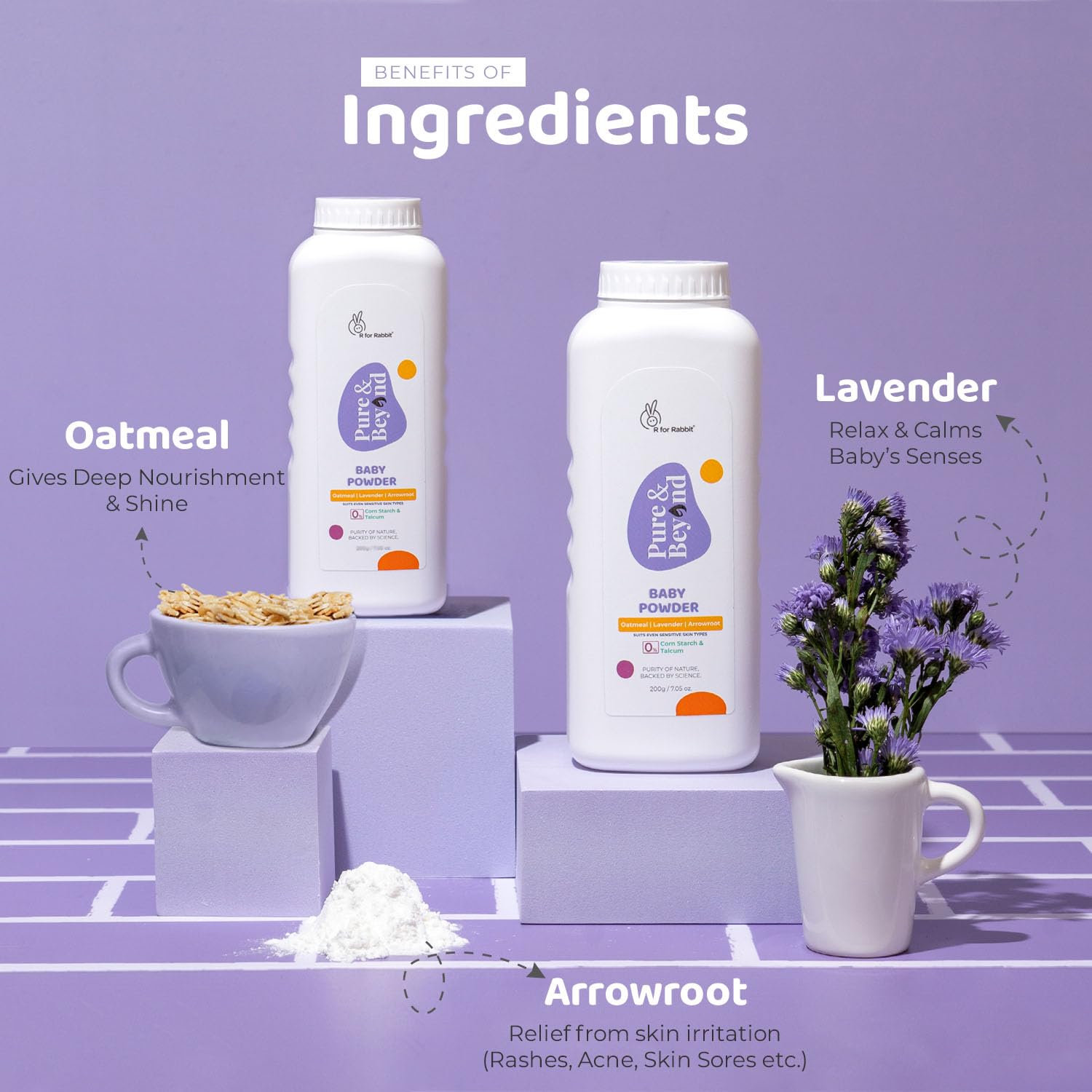 • Deep Nourishment with Calming Effect: Made with Oatmeal and Lavender Oil Pure & Beyond Baby Powder gives deep nourishment and shine to baby’s skin while relaxing and calming their senses.