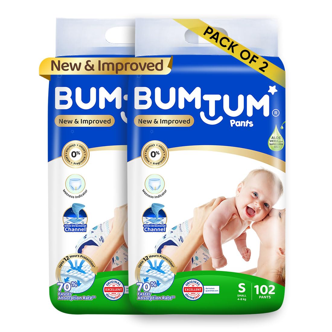 Bumtum Baby Diaper Pants Small/S Size 204 Count Double Layer Leakage Protection Infused With Aloe Vera Cottony Soft High Absorb Technology