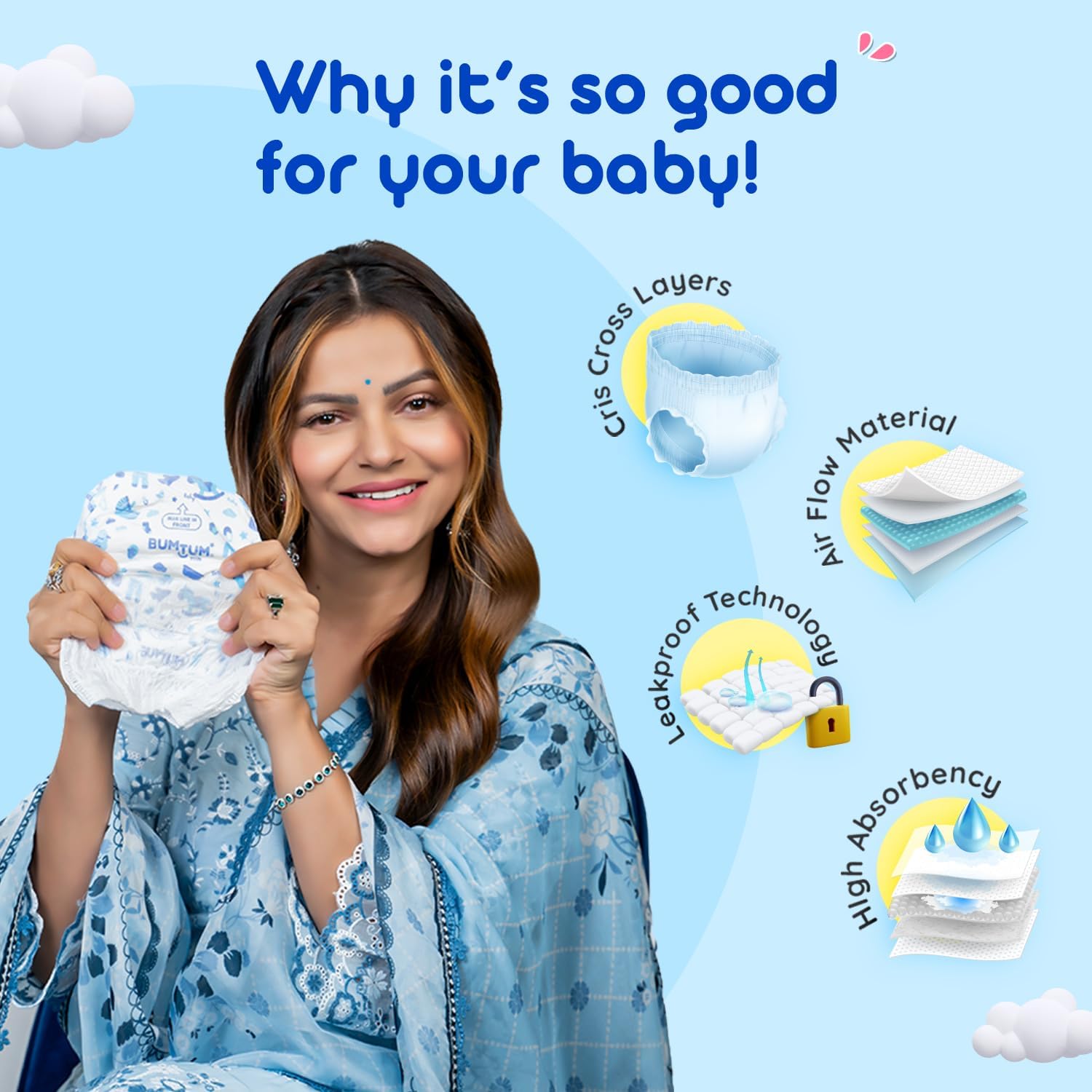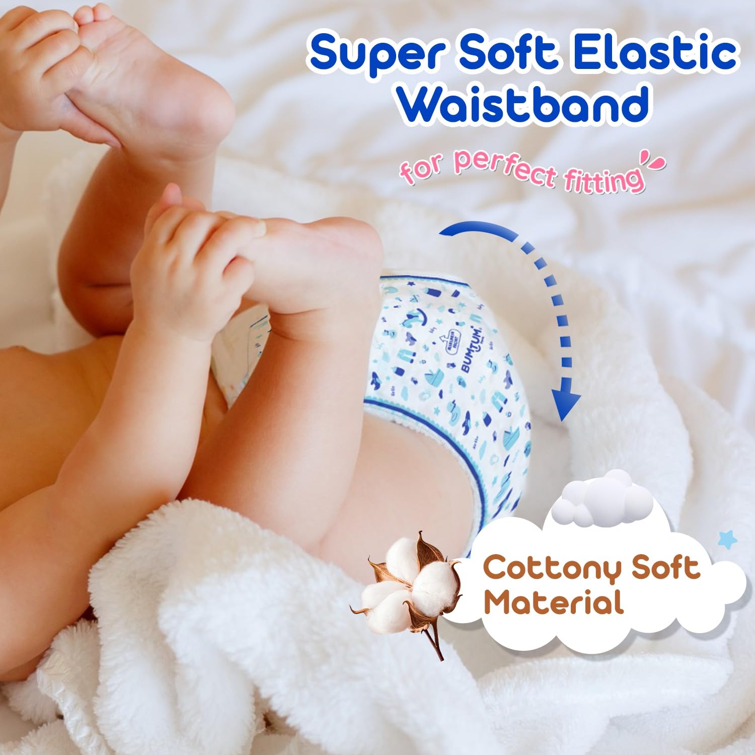 BUMTUM TAPE-STYLE DIAPERS: are uniquely curated to keep your baby's day & night full of comfort and materialized with cottony soft breathable and non-woven material that ensures a cosy experience.