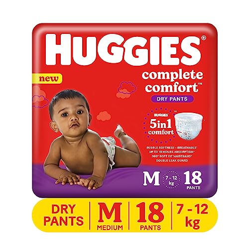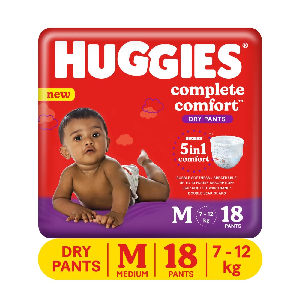 Huggies Complete Comfort Dry Pants Medium (M) Size Baby Diaper Pants, 18 count, with 5 in 1 Comfort