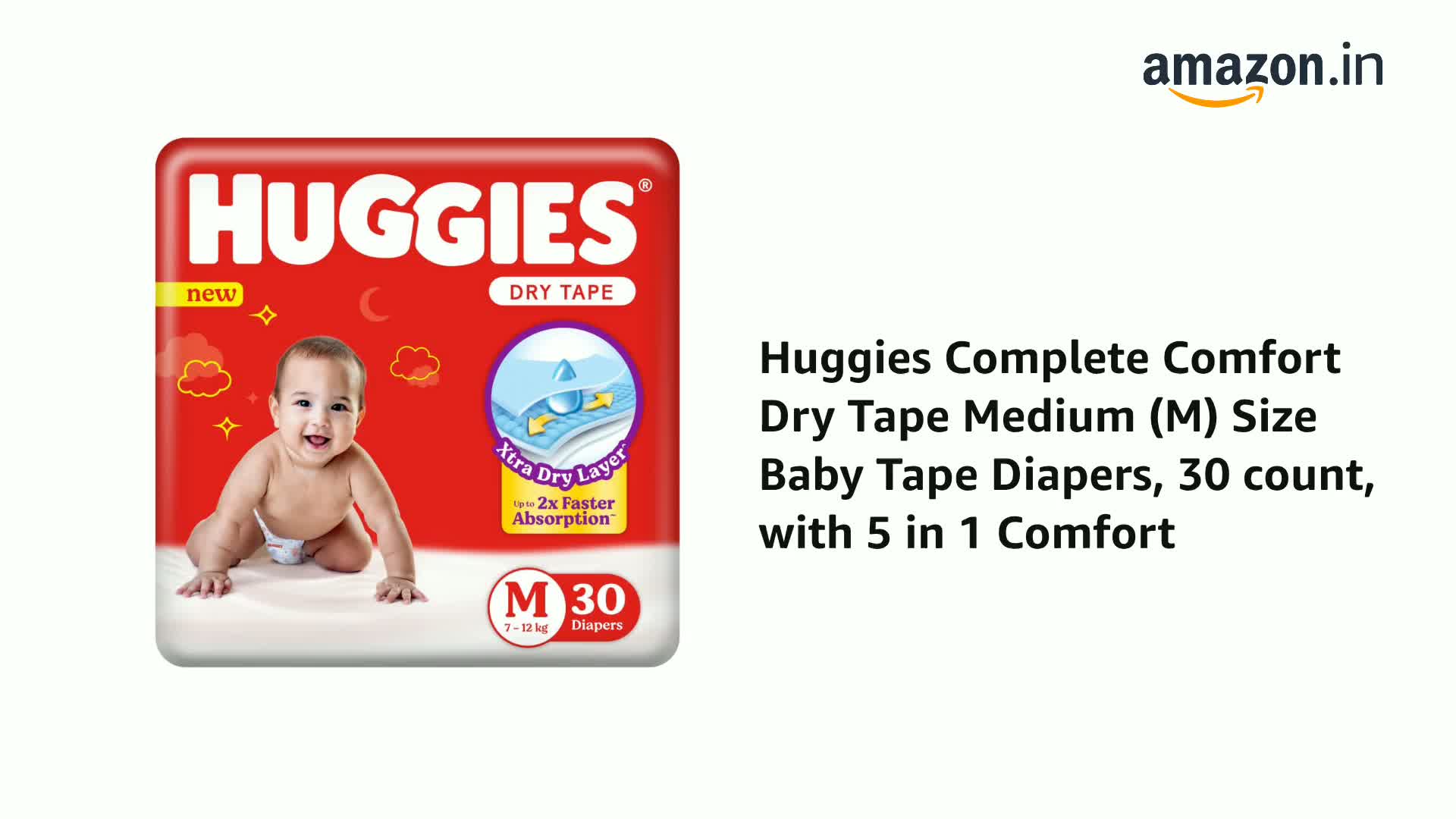 Huggies Complete Comfort Dry Tape Medium (M) Size Baby Tape Diapers, 30 count, with 5 in 1 Comfort