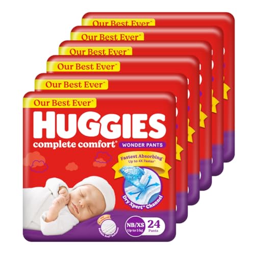 New & Improved Huggies Complete ComfortTM Wonder Pants is India's Fastest Absorbing diaper*. Our best ever^ Diaper Pants absorb upto 4x faster~ now with Dry XpertTM X shaped channel which helps to distribute the urine quickly and evenly to keep your baby dry and comfy. With India's 1st Diaper Pants with Bubble Bed technology Huggies provides a soft inner bubble layer that wraps your baby in softness. Made from air friendly material our diaper pants help your baby's skin to breathe#. Up to 12 Hours of Overnight Absorption@ allows you and your baby to have a comfortable sleep. Double leak guard provides extra padding to fight leakage. Our Pant style diapers are available in all sizes from Newborn/XS S M L XL XXL and XXXL sizes.
