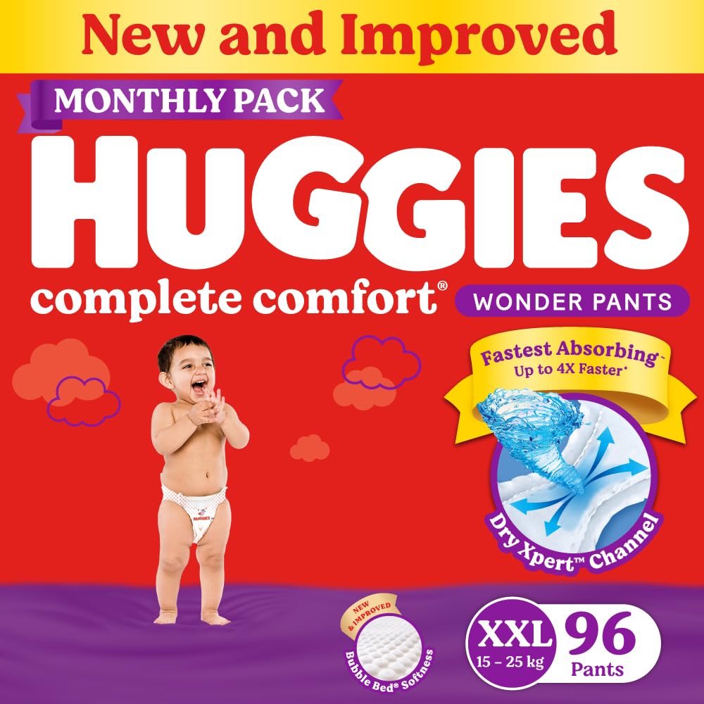 Huggies Complete Comfort Wonder Pants | Pant Style Baby Diapers XXL Size, 96 Count | India's Fastest Absorbing Diaper, Patented Dry Xpert Channel, Ideal for 15 to 25 Kgs