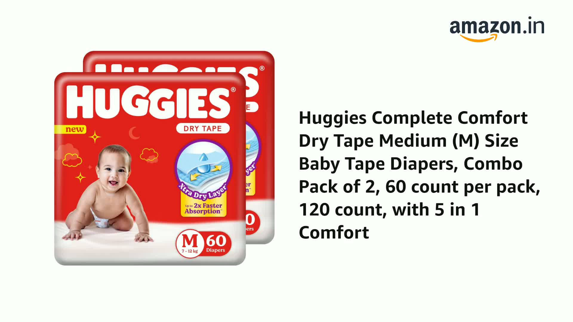 Huggies Complete Comfort Dry Tape Medium (M) Size Baby Tape Diapers, Combo Pack of 2, 60 count per pack, 120 count, with 5 in 1 Comfort