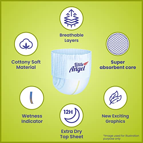 Up to 12 Hours Protection: Little Angel Extra Dry Diaper Pants offer absorbent protection and softness for your baby's skin and breathability to keep it clean and healthy. With a secure fit and long-lasting protection these pants help eliminate leaks for