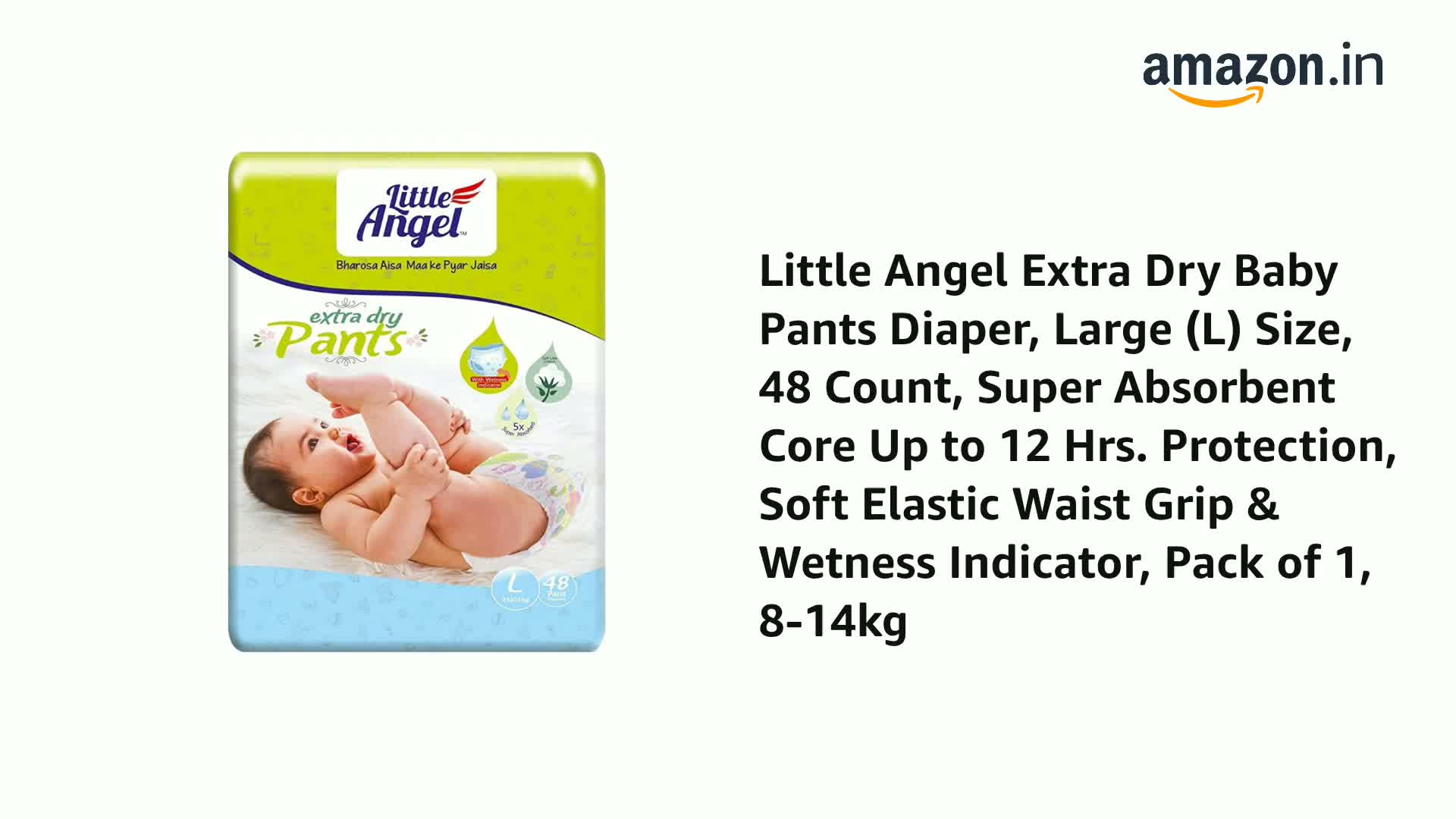 Little Angel Extra Dry Baby Pants Diaper, Large (L) Size, 48 Count, Super Absorbent Core Up to 12 Hrs. Protection, Soft Elastic Waist Grip & Wetness Indicator, Pack of 1, 8-14kg