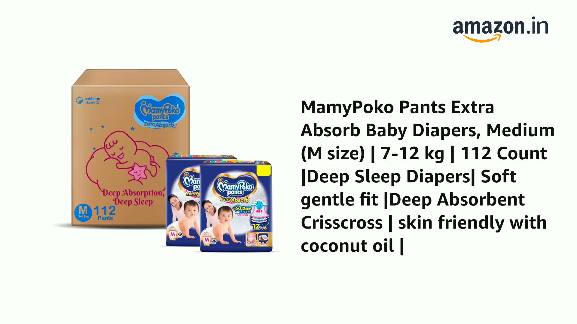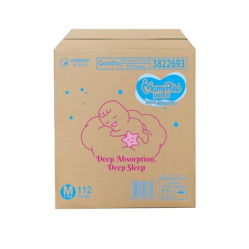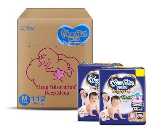 MamyPoko Pants Extra Absorb Baby Diapers, Medium (M size) | 7-12 kg | 112 Count |Deep Sleep Diapers| Soft gentle fit |Deep Absorbent Crisscross | skin friendly with coconut oil |