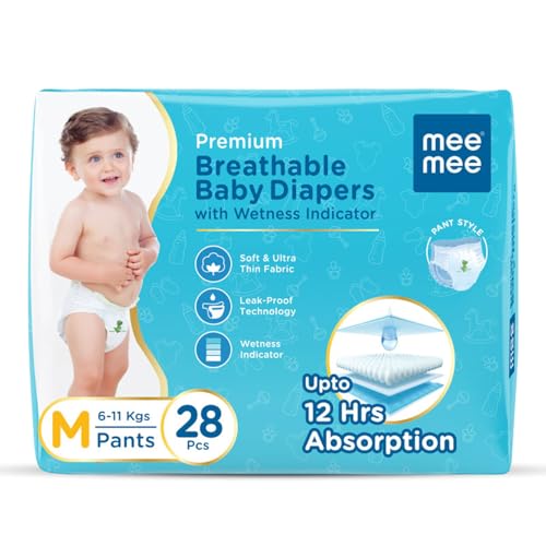 Mee Mee Premium Breathable Baby Diaper Pants, (M) size, Pk of 28 For 6-11 Kgs | Fast Absorbing, Cotton Soft Feel with Wetness Indicator |Double Layer Leakage & Anti-Rash Shield
