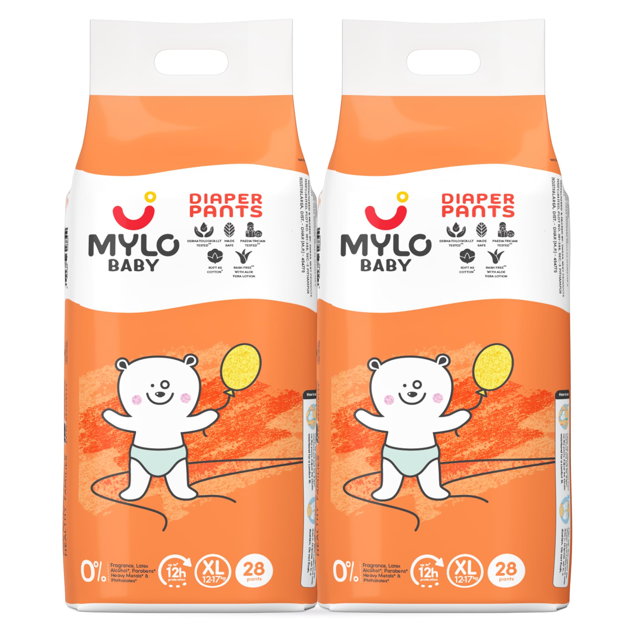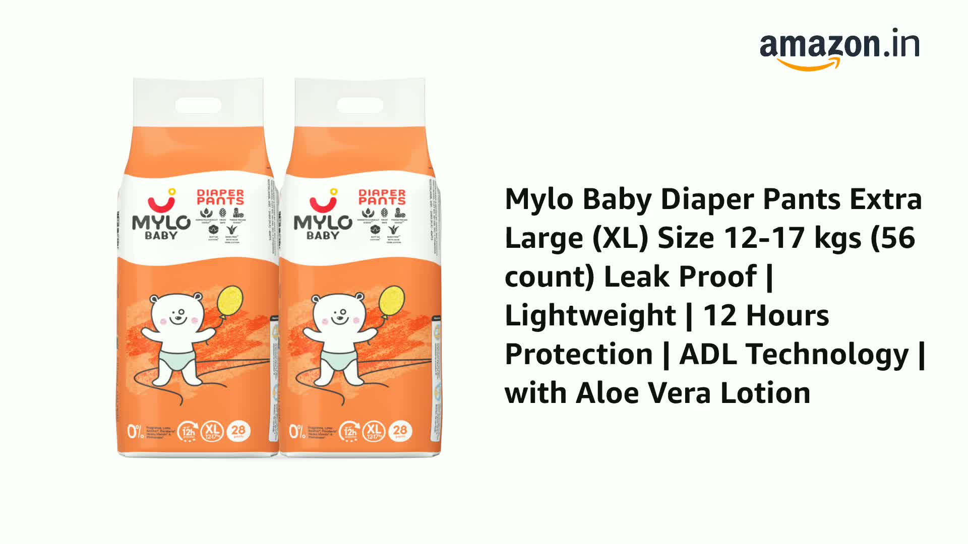 Mylo Baby Diaper Pants Extra Large (XL) Size 12-17 kgs (56 count) Leak Proof | Lightweight | 12 Hours Protection | ADL Technology | with Aloe Vera Lotion