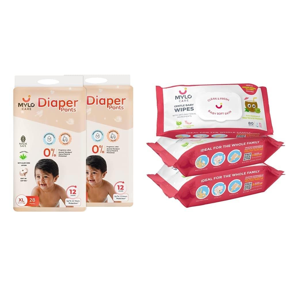 A Pocket-Friendly Solution to Your Baby's Comfort & Hygiene WHAT IT IS- A super saver combo pack that can actually make your monthly diapering needs go smooth convenient & effective. Once stocked you will never run out of diapers or wipes. This Monthly Super Saver Combo is designed considering the hygiene needs of your child & is budget- friendly too. Be it at home while traveling or at any other outdoor place all you need is Myloâs diapering combo with Indiaâs first baby wet wipes with organic coconut oil & organic aloe vera & Mylo Care Baby Diaper Pants to clean your baby & offer leakage prevention for up to 12 hours. HOW IS OUR PRODUCT DIFFERENT? This unique combo takes care of your babyâs comfort and hygiene. Being 100% chemical free both our diaper and wipes are safe to use even for a newborn. The wipes have multiple uses and can be used by the entire family both indoor & outdoor. The disposable diaper pants are soft & light and provide 12 hours of leak protection. WHY MYLO CARE? All our products are committed to be in harmony with our mission statement of âPersonal Care Range for Your Precious World Internationally Certified All Natural Toxin Free.â At Mylo we aim to provide you and your loved ones with certified and safe anti-allergy products to ensure the best results.