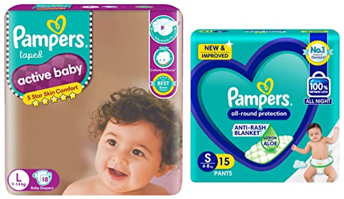 Pampers Active Baby Taped Diapers Large size diapers (L) 18 count taped style custom fit5 Star Skin Protection: The Best tape style diapers from Pampers with an outer layer of cotton-like softness this baby diaper provides intense care to your baby's sensitive skin and protects it effectively from friction rash and redness. These soft and comfort fitting diapers with stretchable sides are best for your baby's rest and playtime. The diaper's fastening tape sticks multiple times thus ensuring it stays in place even after you fasten it after checking your baby's diaper. Protection and nourishment of your baby's skin are taken care of with extracts of moisturizing Aloe Vera lotion characteristic of these best baby diapers.. These diapers are ultra-thin thanks to the absorbent gel material (AGM) commonly known as Magic Gel. This magic gel core of Pampers diapers is highly effective in absorbing frequent wetness. Naturally your baby's skin remains dry for upto12 hours now no more frequent diaper changing or blow leaks for your little angel.Pampers All round Protection Pants Small size baby Diapers (S) 15 Count Lotion with Aloe VeraNEW & IMPROVED Pampers all-round protection pants have ANTI-RASH BLANKET* containing Lotion with Aloe Vera to keep your baby’s skin protected from redness irritation and rashes. quality diapers with 100% WETNESS LOCK keeps the pee locked inside & baby's bum stays dry for ALL NIGHT. Air channels & stretchy belt provides your baby breathable airy fit - comfortable even in summers. Pampers unique Magic gel technology provides up to 12 hours of dryness – and has 2X faster absorption. The new and improved product design enables a comfortable fit closer to the baby’s body and an EXTRA SOFT flexible waist band that adapts to baby’s movements for best comfort. Available in all sizes – Small diapers medium diaper pants large size diaper pants XL diapers XXL diapers XXXL diaper pants. A top layer with cotton-like soft material ensure a comfortable night’s sleep. Our pants with fun exterior graphics fun designs of characters and a delightful fresh Aloe fragrance ensures you enjoy every change with your baby. (*Blanket refers to soft topsheet with lotion. Helps prevent rash due to wetness after 1 day of usage based on clinical studies in USA 2000-2019).