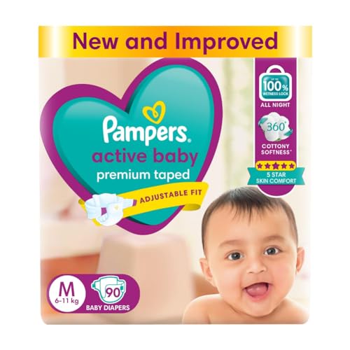 Pampers Active Baby Taped Diapers, Medium size diapers, (6-11kg) 90 count,taped style custom fit