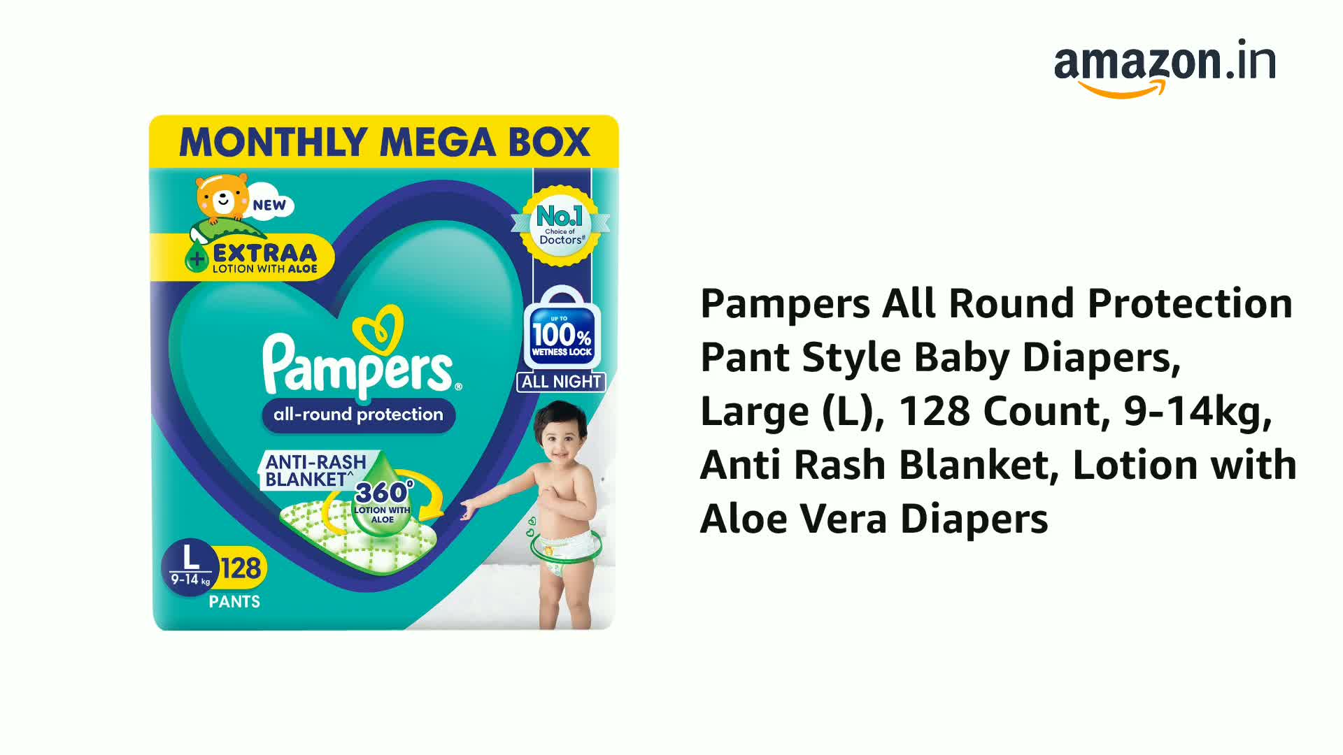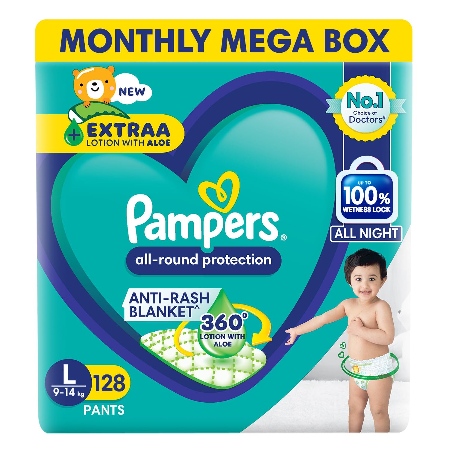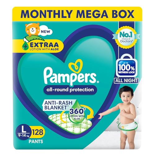 Pampers All Round Protection Pant Style Baby Diapers, Large (L), 128 Count, 9-14kg, Anti Rash Blanket, Lotion with Aloe Vera Diapers