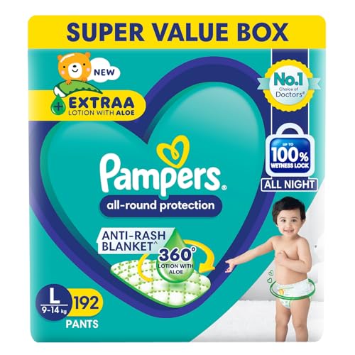 Pampers All Round Protection Pants Style Baby Diapers, Large size (L), 192 Count, 9-14kg, Anti-rash Blanket, 360 degree, Lotion with Aloe Vera