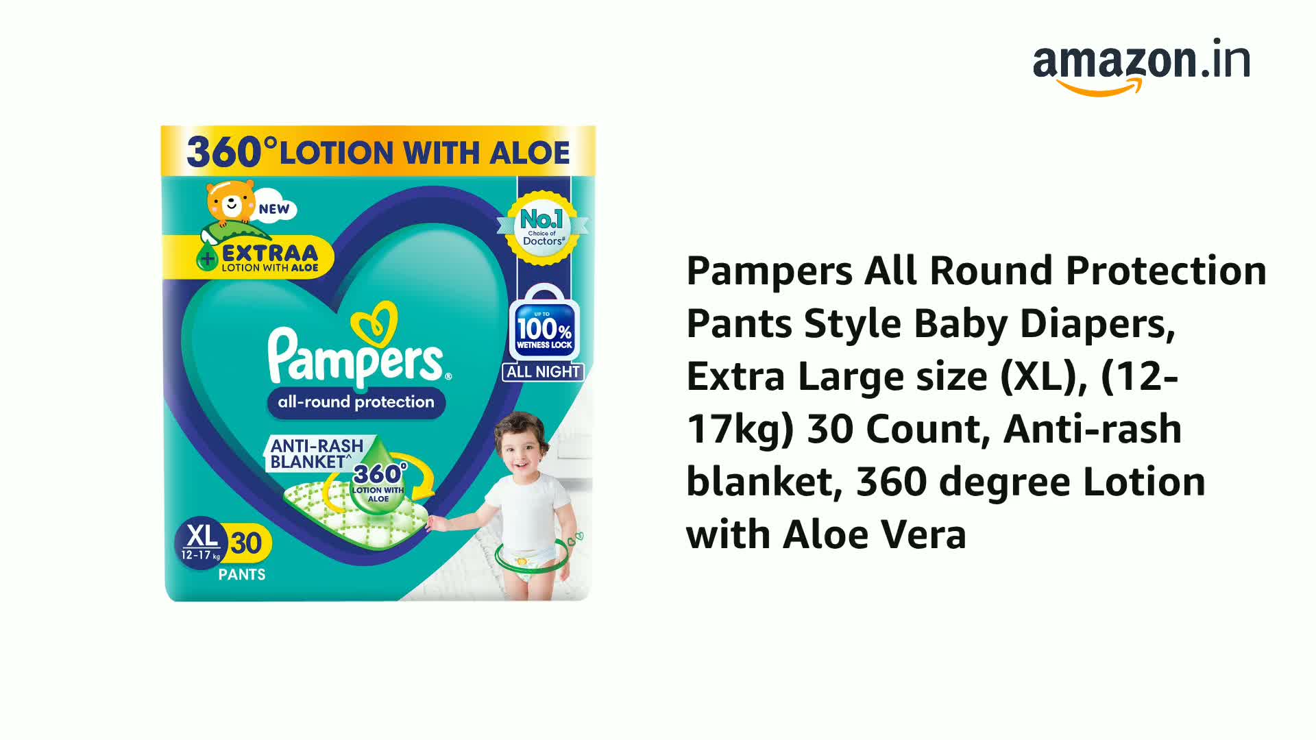 NEW IMPROVED Pampers all round protection pants have ANTI RASH BLANKET* containing Lotion with Aloe Vera to keep your baby’s skin protected from redness and rashes. Top quality diaper pants with Up to 100% WETNESS LOCK keeps the pee locked inside and baby's bum stays dry for ALL NIGHT. Air channels & stretchy belt provides your baby breathable airy fit comfortable even in summers. Pampers unique Magic gel technology provides up to 12 hours of dryness and has up to 2X faster absorption The new and improved design has an EXTRA SOFT material and a fit that adapts to baby’s movements for best comfort. Available in all sizes Small diapers medium diaper pants large size diaper pants XL diapers XXL diapers XXXL diaper pants. Our pants with fun exterior graphics fun designs of characters and a delightful fresh Aloe fragrance ensures you enjoy every change with your baby (*Blanket refers to soft topsheet with lotion Helps prevent rash due to wetness after 1 day of usage based on clinical studies in USA 2000 2019)