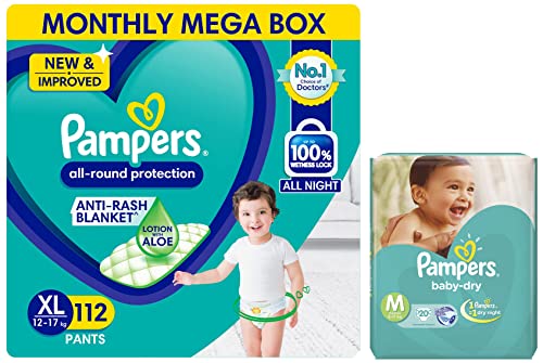 Pampers All round Protection Pants Extra Large size baby Diapers (XL) 112 Count Lotion with Aloe VeraNEW IMPROVED Pampers all round protection pants have ANTI RASH BLANKET* containing Lotion with Aloe Vera to keep your baby’s skin protected from redness and rashes. Top quality diaper pants with Up to 100% WETNESS LOCK keeps the pee locked inside and baby's bum stays dry for ALL NIGHT. Air channels & stretchy belt provides your baby breathable airy fit comfortable even in summers. Pampers unique Magic gel technology provides up to 12 hours of dryness and has up to 2X faster absorption The new and improved design has an EXTRA SOFT material and a fit that adapts to baby’s movements for best comfort. Available in all sizes Small diapers medium diaper pants large size diaper pants XL diapers XXL diapers XXXL diaper pants. Our pants with fun exterior graphics fun designs of characters and a delightful fresh Aloe fragrance ensures you enjoy every change with your baby (*Blanket refers to soft topsheet with lotion Helps prevent rash due to wetness after 1 day of usage based on clinical studies in USA 2000 2019)Pampers Taped Diapers Medium (MD) 20 countNEW & IMPROVED Pampers all-round protection pants have ANTI-RASH BLANKET* containing Lotion with Aloe Vera to keep your baby’s skin protected from redness irritation and rashes. quality diapers with 100% WETNESS LOCK keeps the pee locked inside & baby's bum stays dry for ALL NIGHT. Air channels & stretchy belt provides your baby breathable airy fit - comfortable even in summers. Pampers unique Magic gel technology provides up to 12 hours of dryness – and has 2X faster absorption. The new and improved product design enables a comfortable fit closer to the baby’s body and an EXTRA SOFT flexible waist band that adapts to baby’s movements for best comfort. Available in all sizes – Small diapers medium diaper pants large size diaper pants XL diapers XXL diapers XXXL diaper pants. A top layer with cotton-like soft material ensure a comfortable night’s sleep. Our pants with fun exterior graphics fun designs of characters and a delightful fresh Aloe fragrance ensures you enjoy every change with your baby. (*Blanket refers to soft topsheet with lotion. Helps prevent rash due to wetness after 1 day of usage based on clinical studies in USA 2000-2019).