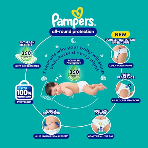 Pampers all round protection pants have ANTI-RASH* lotion with aloe vera to keep your baby’s skin protected. Newborn baby diapers containing Lotion with Aloe vera helps protect your baby’s delicate skin from diaper rash and irritation. Best diapers with Ultra Absorb Core provides your baby a new type of dryness overnight - breathable dryness. Magic gel locks wetness away to provide up to 12 hours of dryness. The new and improved product design enables a comfortable fit closer to the baby’s body and a flexible waist band that adapts to baby’s movements for a comfortable fit. Available in all sizes – Small diapers medium diaper pants large size diaper pants xl diapers xxl diapers xxxl diaper pants. A top layer with cotton-like soft material ensure a comfortable night’s sleep. Our pants with fun exterior graphics fun designs and characters ensure you enjoy with your baby. ​*Helps prevent rash due to wetness after 1 day of usage based on clinical studies in USA 2000-2019.