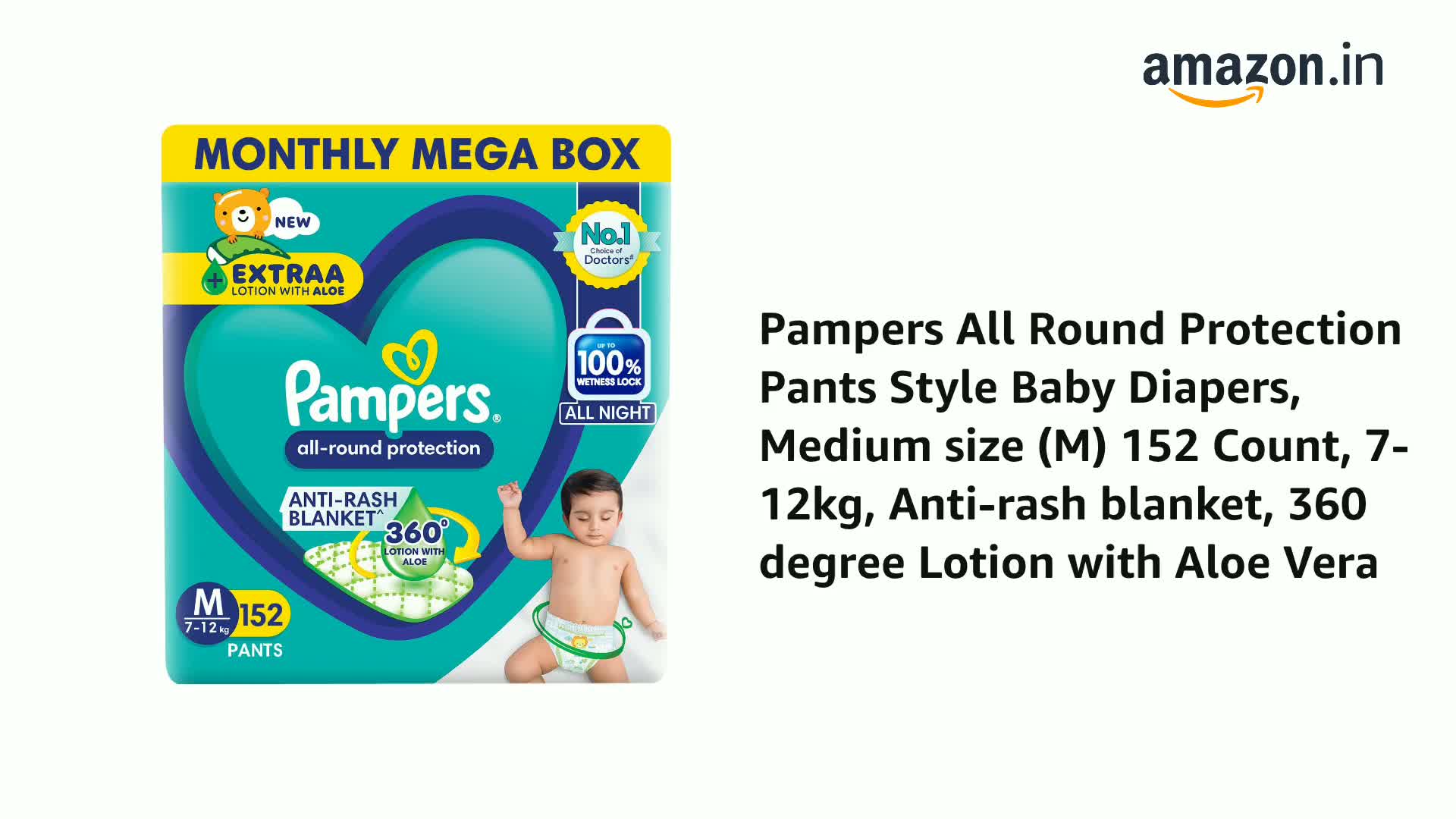 Pampers All Round Protection Pants Style Baby Diapers, Medium size (M) 152 Count, 7-12kg, Anti-rash blanket, 360 degree Lotion with Aloe Vera