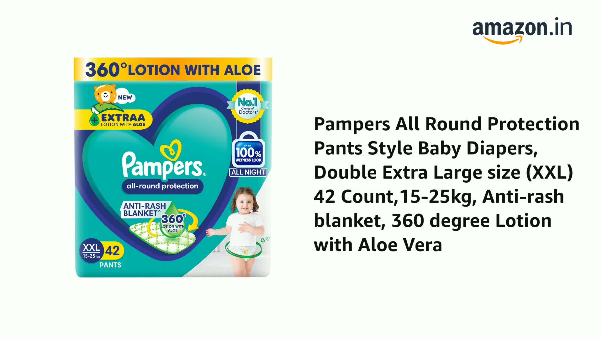 Pampers All Round Protection Pants Style Baby Diapers, Double Extra Large size (XXL) 42 Count,15-25kg, Anti-rash blanket, 360 degree Lotion with Aloe Vera