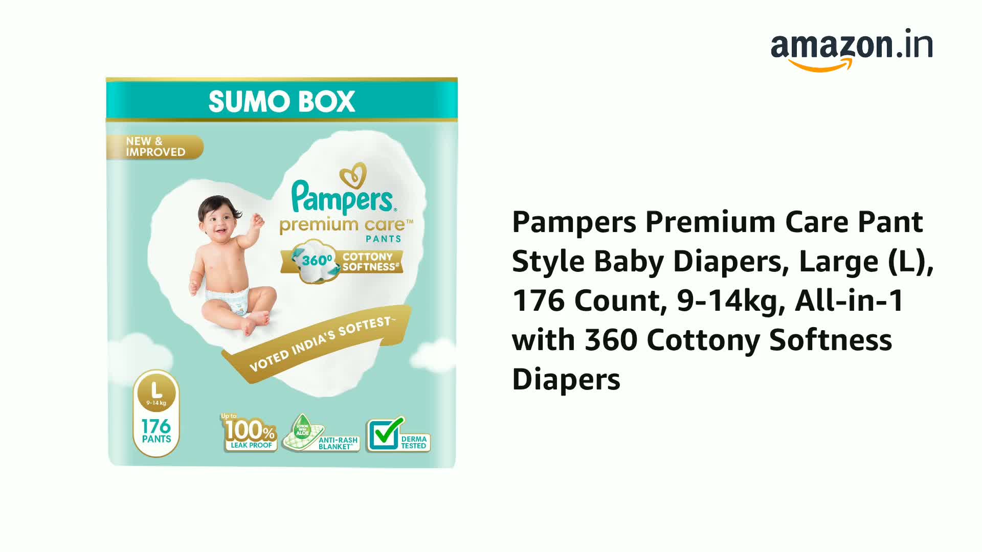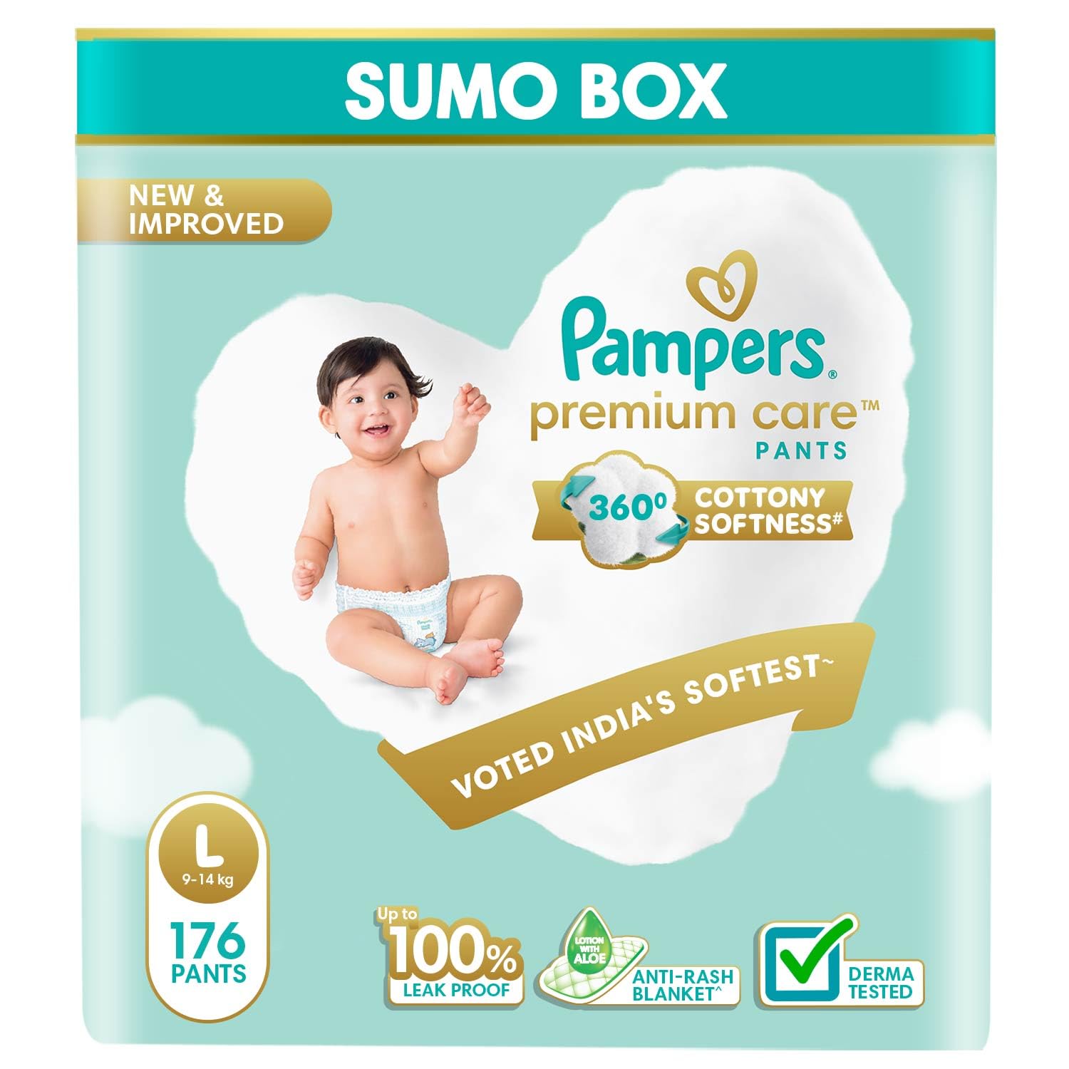 Pampers Premium Care Pant Style Baby Diapers, Large (L), 176 Count, 9-14kg, All-in-1 with 360 Cottony Softness Diapers