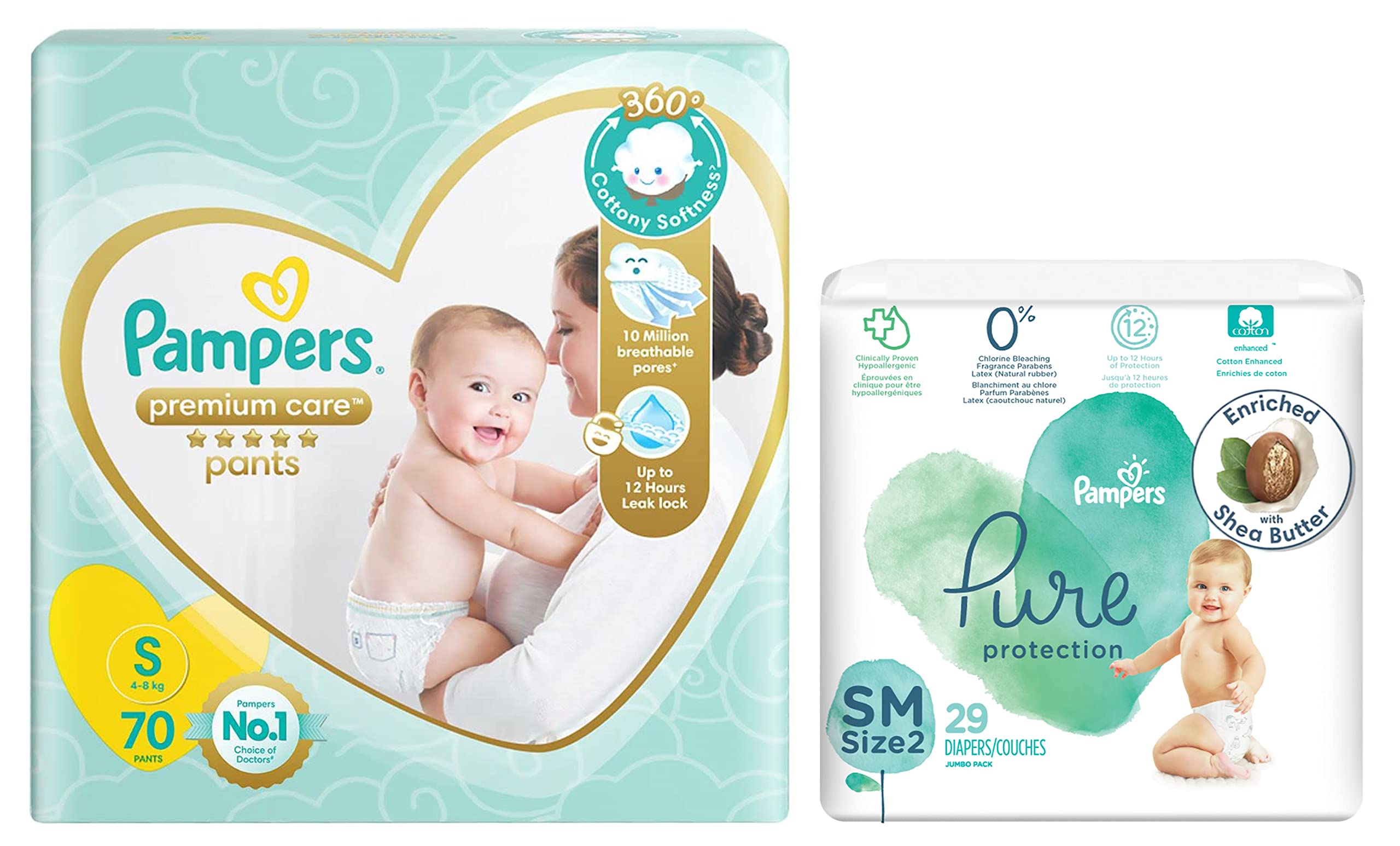 Pampers Premium Care Pants Extra Large size baby Diapers (XL) 72 Count Softest ever Pampers PantsNew Pampers Premium Care Pants with 360 degree cottony softness gives your baby the ultimate comfort all day all night long. Pampers Premium Care Pants contain soothing lotion with Aloe Vera to protect your baby’s skin from rashes while its 10 million micropores allow your baby’s skin to breathe. Its 12-hour leak lock facility keeps your baby dry and away from wetness. Experience 5-Star comfort with unique added features like Wetness Indicator which turns Yellow to Blue indicating when you may change the diaper and a Disposal Tape to help you with easy disposal. Pampers Premium Pants are available in New-born (NB) S M L XL and XXL sizes.Pampers Active Baby Taped Diapers Extra Large size diapers (XL) 56 count taped style custom fit5 Star Skin Protection: The Best tape style diapers from Pampers with an outer layer of cotton-like softness this baby diaper provides intense care to your baby's sensitive skin and protects it effectively from friction rash and redness. These soft and comfort fitting diapers with stretchable sides are best for your baby's rest and playtime. The diaper's fastening tape sticks multiple times thus ensuring it stays in place even after you fasten it after checking your baby's diaper. Protection and nourishment of your baby's skin are taken care of with extracts of moisturizing Aloe Vera lotion characteristic of these best baby diapers.. These diapers are ultra-thin thanks to the absorbent gel material (AGM) commonly known as Magic Gel. This magic gel core of Pampers diapers is highly effective in absorbing frequent wetness. Naturally your baby's skin remains dry for upto 12 hours now no more frequent diaper changing or blow leaks for your little angel.