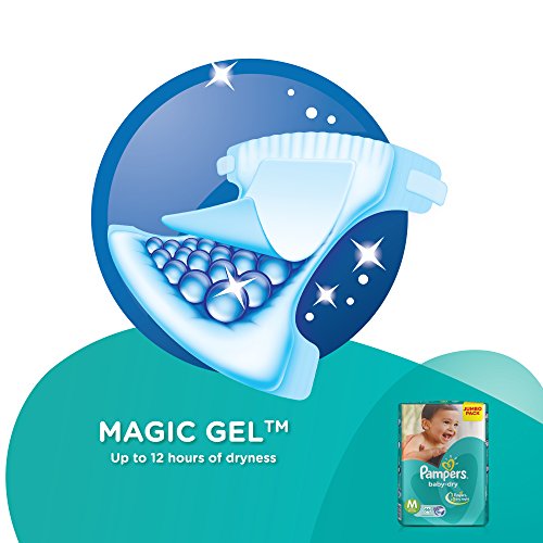 Pampers Taped Baby Diapers Medium (MD) 66 countNEW & IMPROVED Pampers all-round protection pants have ANTI-RASH BLANKET* containing Lotion with Aloe Vera to keep your baby’s skin protected from redness irritation and rashes. quality diapers with 100% WETNESS LOCK keeps the pee locked inside & baby's bum stays dry for ALL NIGHT. Air channels & stretchy belt provides your baby breathable airy fit - comfortable even in summers. Pampers unique Magic gel technology provides up to 12 hours of dryness – and has 2X faster absorption. The new and improved product design enables a comfortable fit closer to the baby’s body and an EXTRA SOFT flexible waist band that adapts to baby’s movements for best comfort. Available in all sizes – Small diapers medium diaper pants large size diaper pants XL diapers XXL diapers XXXL diaper pants. A top layer with cotton-like soft material ensure a comfortable night’s sleep. Our pants with fun exterior graphics fun designs of characters and a delightful fresh Aloe fragrance ensures you enjoy every change with your baby. (*Blanket refers to soft topsheet with lotion. Helps prevent rash due to wetness after 1 day of usage based on clinical studies in USA 2000-2019). view larger Size chart Now New Pampers with magic gel can absorb quicker and hence keep the skin dry for upto 10 hours. So your baby's skin will be dry throughout the night and give him a peaceful undisturbed golden sleep. When to Change a Diaper In the first couple of months you may find yourself changing diapers up to 10 times in 24 hours. Diapers should be changed whenever they are wet or soiled. Your baby will often (but not always) let you know. With a super-absorbent diaper like Pampers diapers you can tell if it's wet by urine indicator or by feeling for lumps in the absorbent material. Here are some common times for changing diapers: Right before or right after every feeding After every bowel movement Before bedtime When your baby wakes up When you go out with your baby The Art of Changing Diapers Pampers Diapers are designed to adjust to your baby's shape for a snug comfortable fit. While changing diapers there's no need to fold the waistband in or out or to adjust the leg cuffs. Place tabs parallel to the waistband and centered on the character strip. Use the characters as guides to ensure the fasteners are evenly spaced. Keep baby products such as powder away from the fasteners so they maintain their stickiness. Wiping baby bottoms Have a supply of baby wipes or clean wet tissues handy while changing diapers to help keep your baby clean and fresh. For baby girls while changing diapers always wipe from front to back to minimize the amount of stool material that gets near her genitals. Also be careful to clean all areas as the folds in the skin around her genitals can hide urine and soil. Treating and preventing diaper rash Red bumps on your baby's bottom may mean diaper rash. It can be caused by many factors including leaving urine or bowel movement on the skin too long between changing diapers or even as a result of taking antibiotics. And when your baby starts solid foods wait a few days between introducing each new food to see if the rash was caused by a particular food. If your baby has diaper rash clean the entire diapered area gently but thoroughly with a baby wipe or a clean wet tissue. It is also helpful to allow air to reach the skin. Talk to your paediatrician or pharmacist if the rash does not improve. Finding the right size Just like you babies like to wear things that fit just right. Choose a size that does not sag or gap even as your baby crawls and plays. This will help prevent leaks. Each product description on this site gives guidelines that represent the average weight for a particular size. And remember when you move up a size you gain absorbency. Weighing babies The easiest way to weigh your baby is to first hop on the scale yourself. See how much you weigh then see how much you weigh when you hold your baby. If you subtract your weight you'll know how much your baby weighs. Safe diapering You buy the latest toys and babies wind up playing with silly things - like diapers. It's important to keep diapers where they should be on your baby's bottom. Don't let your baby put the diaper in her mouth. Discard any diaper that has become torn or unsealed and read the warning label on all bags. Diaper gel facts AGM is the absorbent gelling material widely used in diaper padding to absorb wetness. It is perfectly normal to see some gel on the skin from time to time especially if the diaper is heavily saturated. It can easily be removed by wiping your baby's skin. This material has a long history of safe use in a variety of products and has been in diapers for more than a decade. Absorbent gelling material is closely related to ingredients widely used in cosmetics in food processing and as binders in medicine capsules. Waste removal As the Pampers bag recommends you'll want to dump bowel movements in the toilet. Then just roll the diaper into its backsheet using the tape or fasteners to keep it closed and dispose of it in the trash. Diaper storage Store your diapers in an area protected from extreme heat and humidity and away from products with fragrances. We recommend the diaper be kept in a dry storage area where the temperature is 85 degrees or less.Pampers All round Protection Pants Small size baby diapers (SM) 86 Count Anti Rash diapers Lotion with Aloe VeraNEW & IMPROVED Pampers all-round protection pants have ANTI-RASH BLANKET* containing Lotion with Aloe Vera to keep your baby’s skin protected from redness irritation and rashes. quality diapers with 100% WETNESS LOCK keeps the pee locked inside & baby's bum stays dry for ALL NIGHT. Air channels & stretchy belt provides your baby breathable airy fit - comfortable even in summers. Pampers unique Magic gel technology provides up to 12 hours of dryness – and has 2X faster absorption. The new and improved product desi