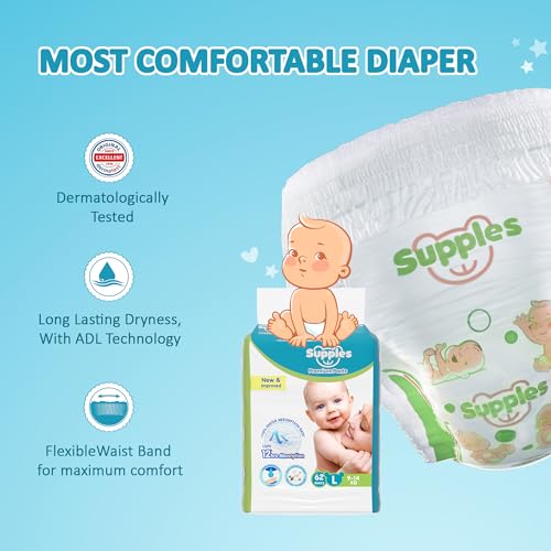 SUPPLES PREMIUM DIAPER PANTS: Choosing the diaper for your baby is an important step in ensuring your little one comfort during the day as well as overnight. We understand that nothing is more important than the comfort of your little baby. With Supples Premium diaper pants we want to keep your baby comfortable both in day as well as in night thus delivering happiness to every doorstep. Choosing the right diaper size based on baby weight is important. The diaper capacity may vary among babies depending on the volume of pee and posture. Available in sizes NB S M L XL XXL