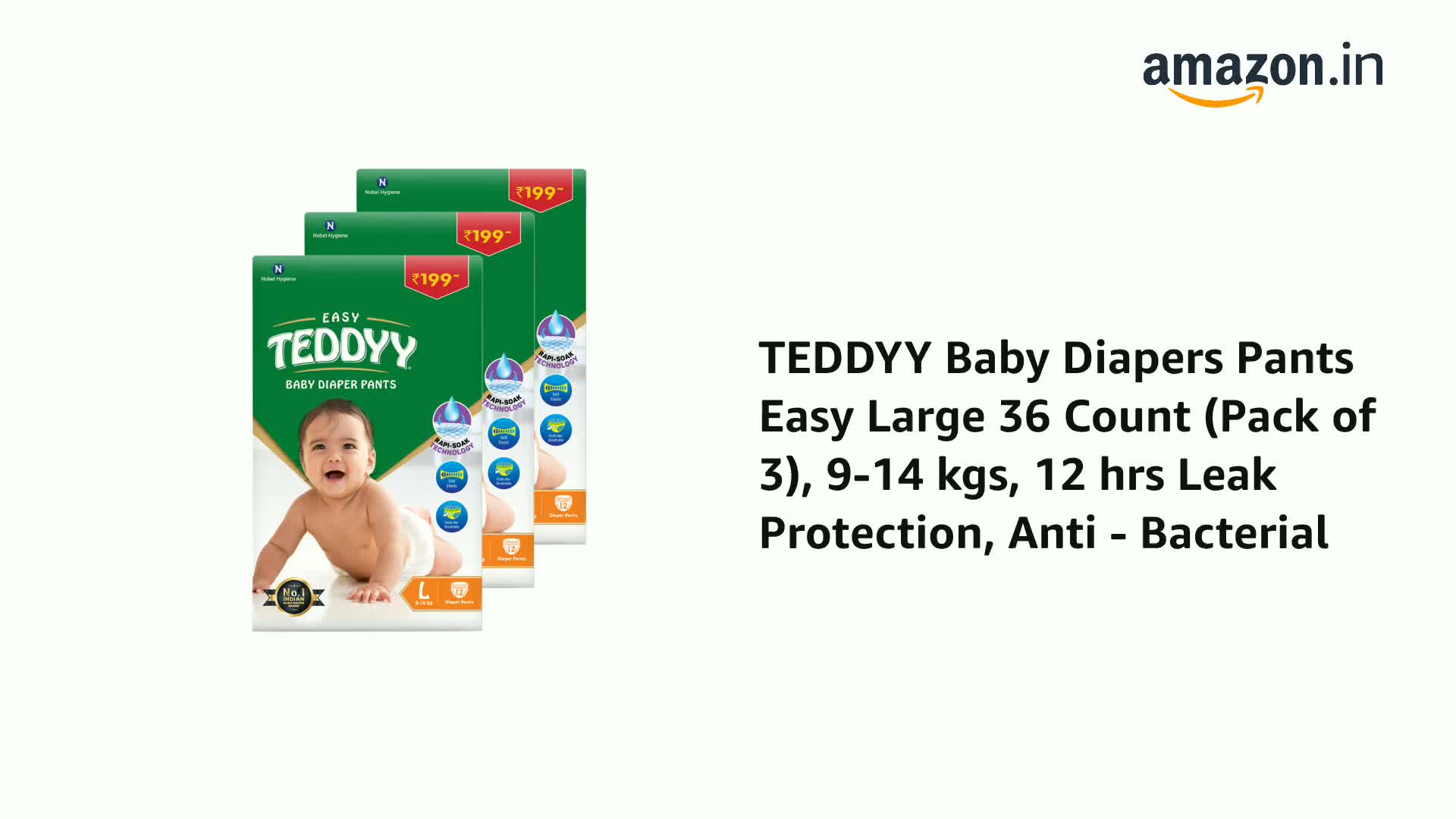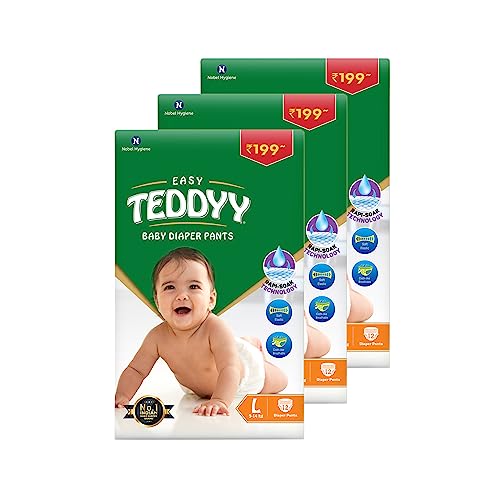 TEDDYY Baby Diapers Pants Easy Large 36 Count (Pack of 3), 9-14 kgs, 12 hrs Leak Protection, Anti - Bacterial