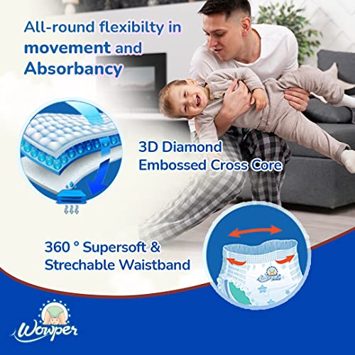 • All-Day Protection: With a secure and snug fit WowPer Baby Diapers provide reliable protection against leaks and accidents giving you peace of mind throughout the day. Enjoy worry-free outings and playtime with your little one!