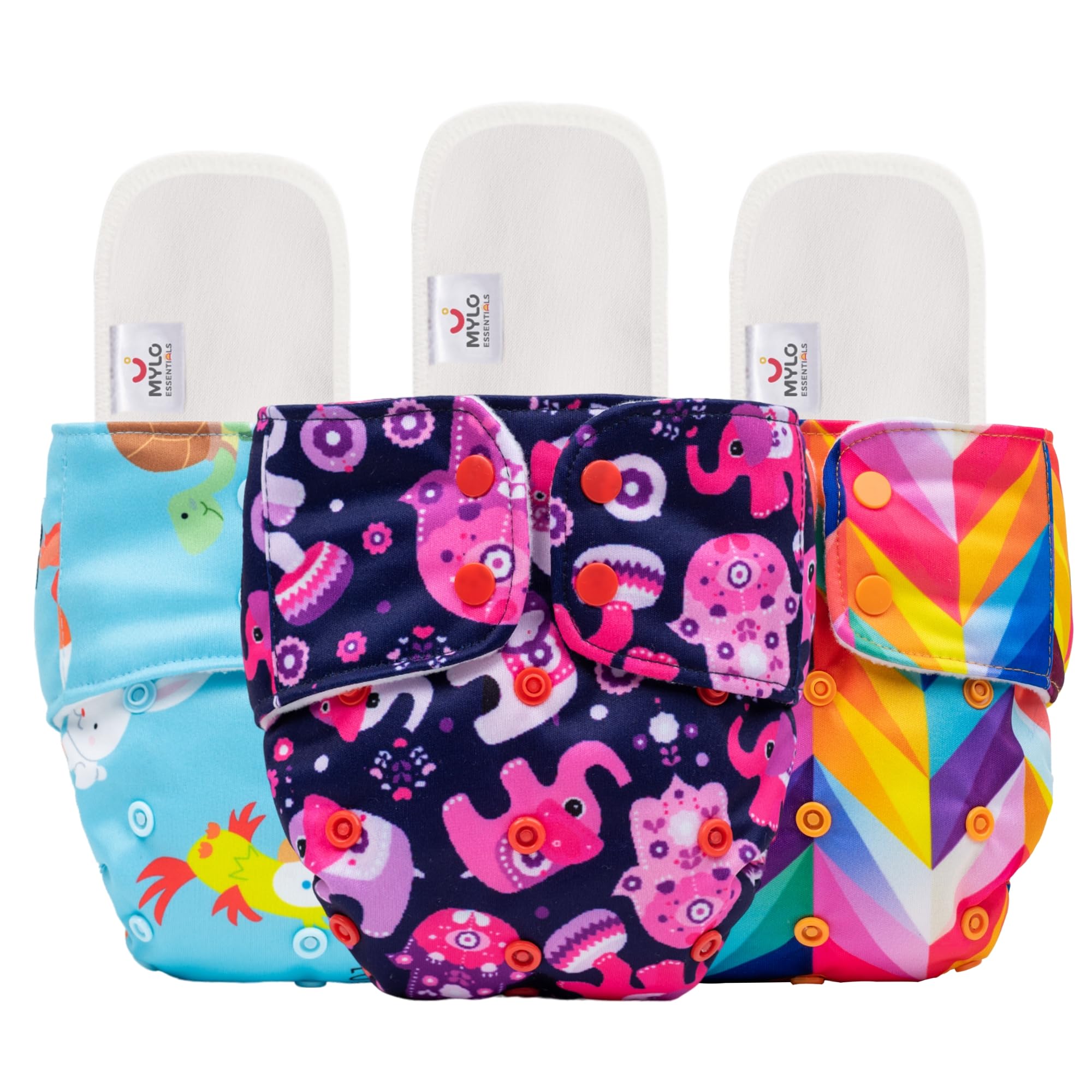 Mylo Leak-Proof Baby Cloth Diaper Combo (3 Diapers + 3 Inserts) | Free Size (3M-3Y) | High Absorption | Quick Dry | Oeko-Tex Certified | Washable - Rainbow, Purple Love & Pet Love