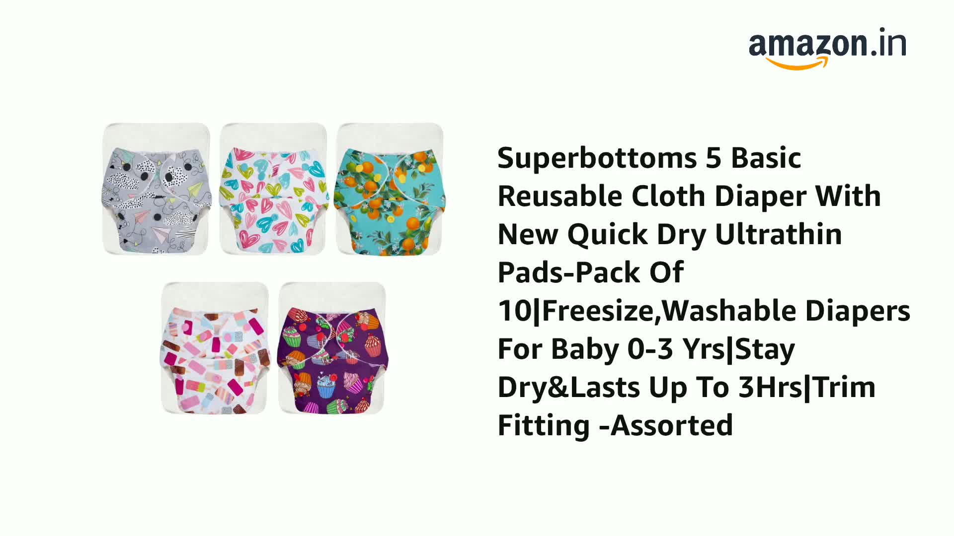 Superbottoms 5 Basic Reusable Cloth Diaper With New Quick Dry Ultrathin Pads-Pack Of 10|FreesizeWashable Diapers For Baby 0-3 Yrs|Stay Dry&Lasts Up To 3Hrs|Trim Fitting -Assorted