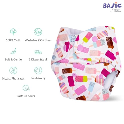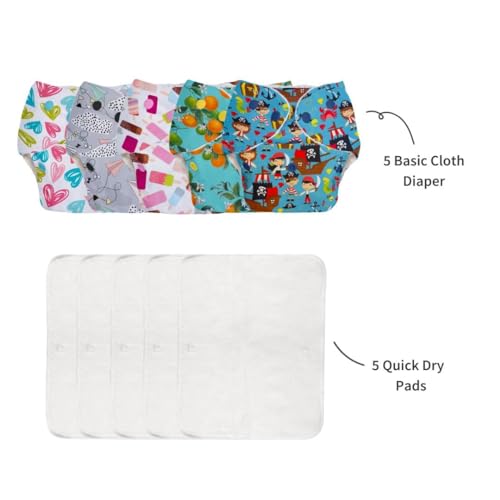 superbottoms Basic 5 Reusable Cloth Diaper For Babies 0-3Y | Freesize, Washable Baby Diapers (With Dry Feel Pad/Insert), 5 Count