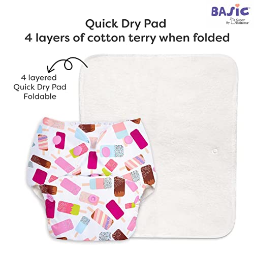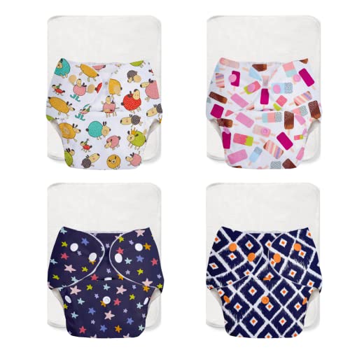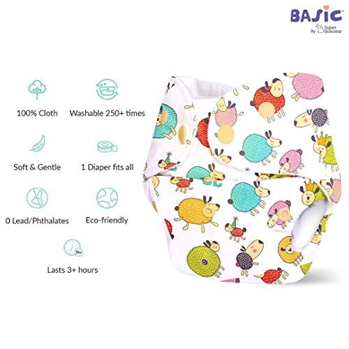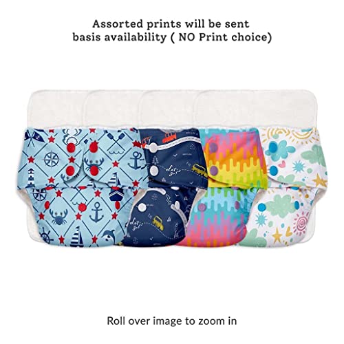 Superbottoms BASIC EASY - Pack of 8 |4 Cloth Diapers+ 4 Inserts - Freesize Adjustable & Reusable Cloth Diaper for babies 0-3 Years | With quick drying prefold style soaker-Assorted